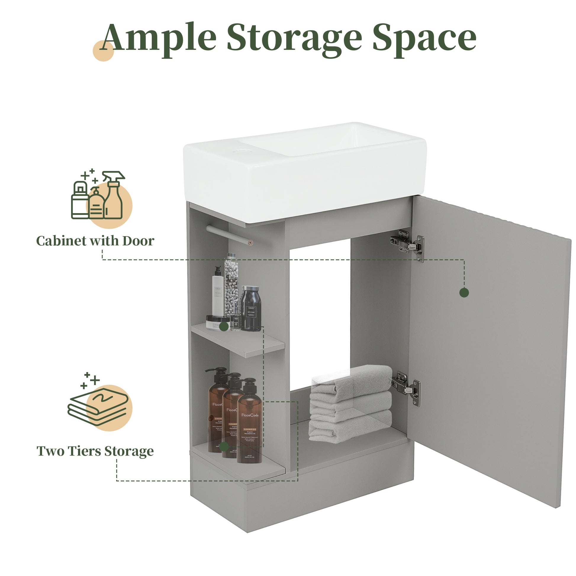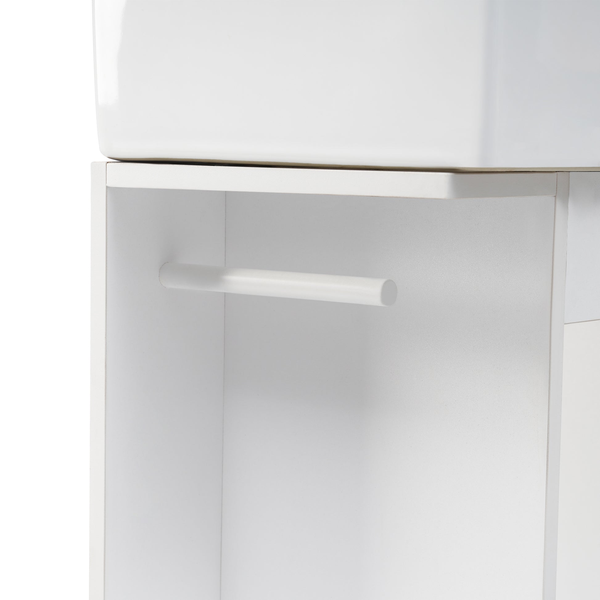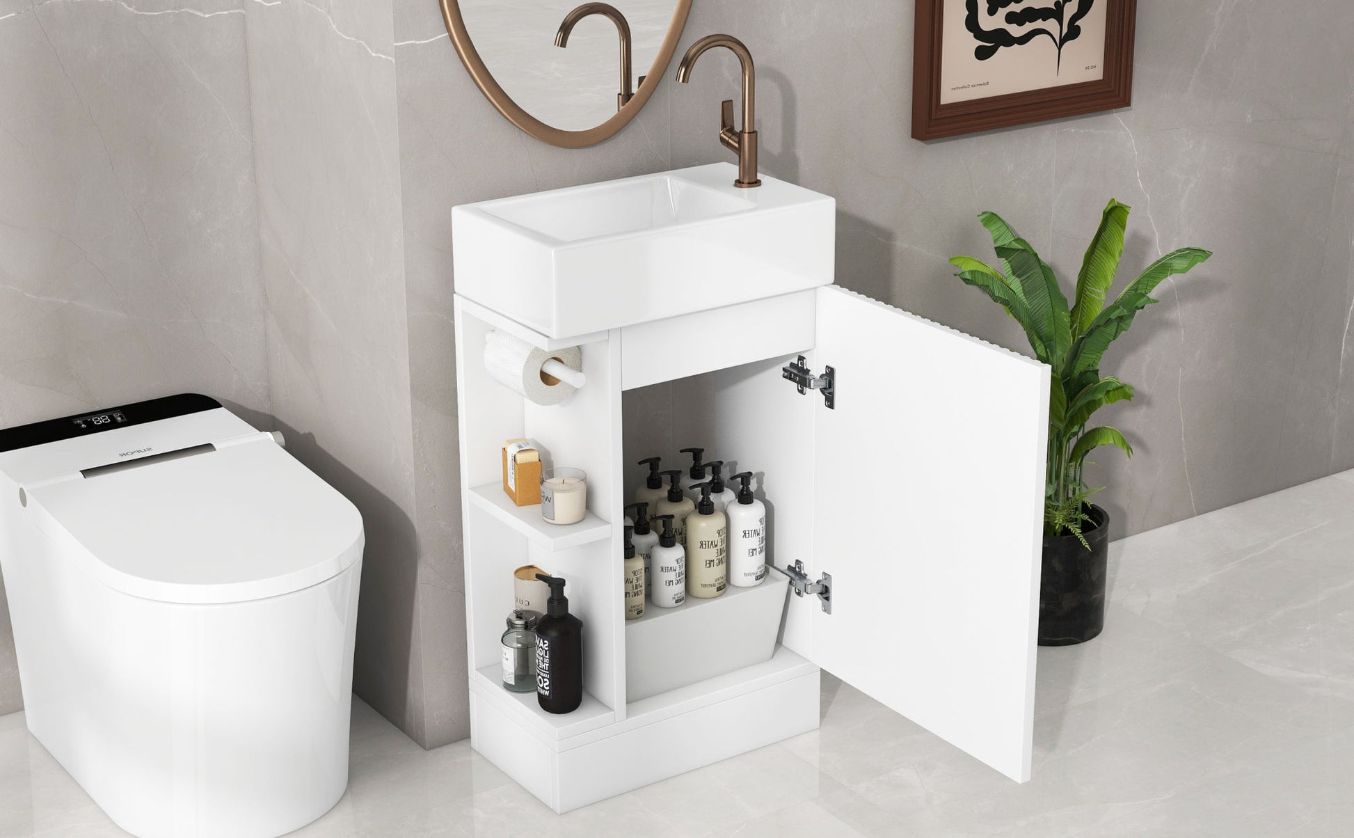 Vanity with Cabinet & Toilet Paper Holder & Shelf - This bathroom vanity has different storage space: one cabinet with door, two-tier storage shelf on the side, and toilet paper holder. You can put soaps, towels, shampoos, tissue paper and other bathroom essentials in it.
