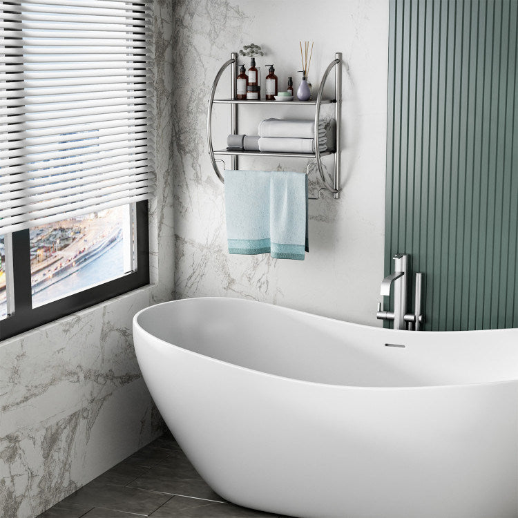 Brand new and high qualityWall-mounted design; maximizing the bathroom space2 tier plates and 2 towel barChrome-plated iron; durable; rugged and anti-corrosionModern and stylish; ideal for any bathroomSimple assemble requirement