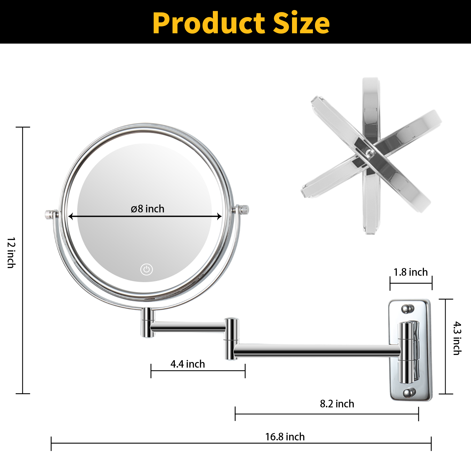 360° Swivel and Extendable Metal Arm: This makeup mirror is designed with an extending arm that you can smoothly extend and fold,and the long arm can be adjusted up and down to suit people with different needs.The max lenghs of extension arm is 14.7".