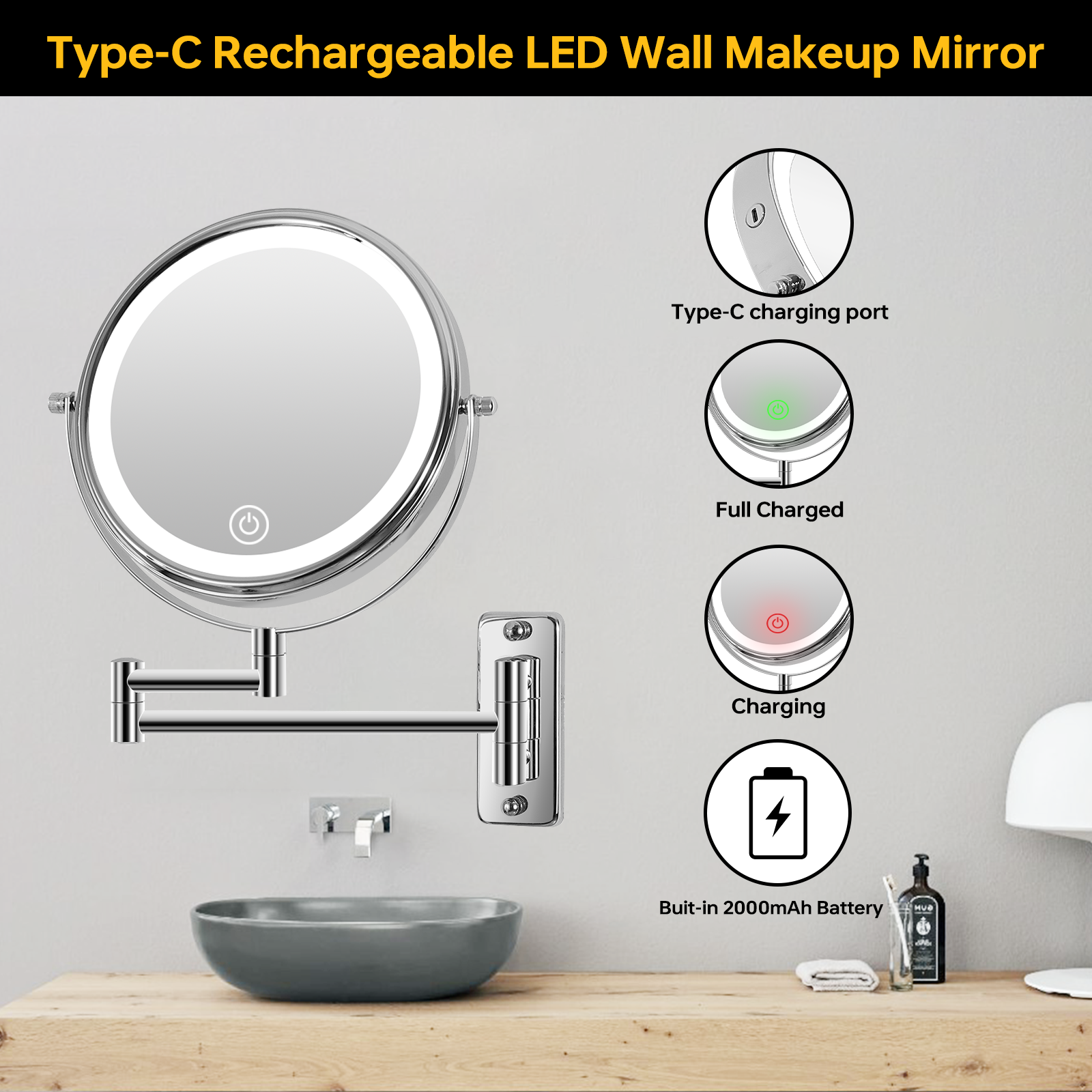Rechargeable LED Vanity Mirror: The wall mirror has a built-in 2000mAh rechargeable battery, no need to replace the batteries.T-C charging port adapts to most USB charging cables (included), convenient for you to use it anywhere.