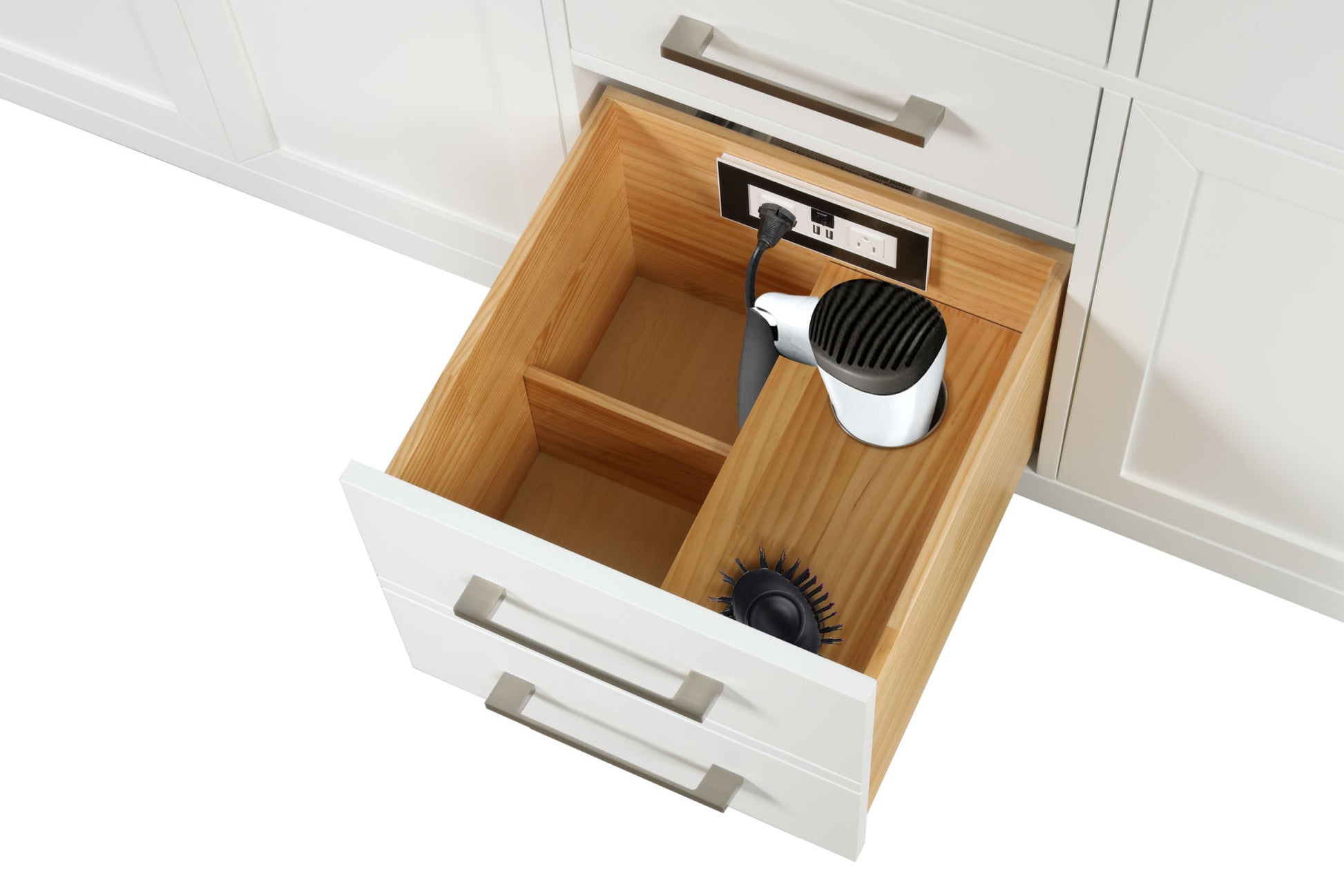Powerful Storage: Considering the practicality, this bathroom cabinet includes 3 drawers with soft close, and four doors behind with adjustable shelves; and there is a power station box You can put hair dryers, curlers,and other items inside to keep your bathroom stuff away from dust and more orderly.