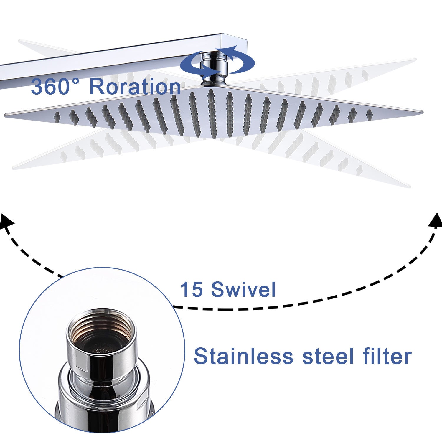 1. Item Weight: 12.57pounds 2. Package Dimensions: 18.9*14.96*9.94in 3. Is Discontinued By Manufacturer: No 4. Size :12 Inch 5. Color: Chrome 6. Finish:Chrome 7. Material: Stainless Steel, Brass 8. Shape:Rectangle 9. Installation: Method Wall-Mounted 10.Item Package Quantity: 1 11.Included Components: Shower arm, rain shower head, handheld shower head, shower valve faucet, shower bracket holder, shower hose 12.Batteries Included?: No 13.Batteries Required? No1. Includes: L Style Brass Handheld Shower Head,12 Inch304 Stainless Steel Rain Shower Head and Solid Brass Shower Mixer Valve 2. 16 Inch (40cm) Metal Shower Arm and 59 Inch Shower Hose, Concealed installation Brass Shower Bracket Holder 3. Nice plated finish offers a sleek look, ensuring corrosion resistance and durable 4. Air energy technology offer consistent powerful rain shower even under low water pressure.