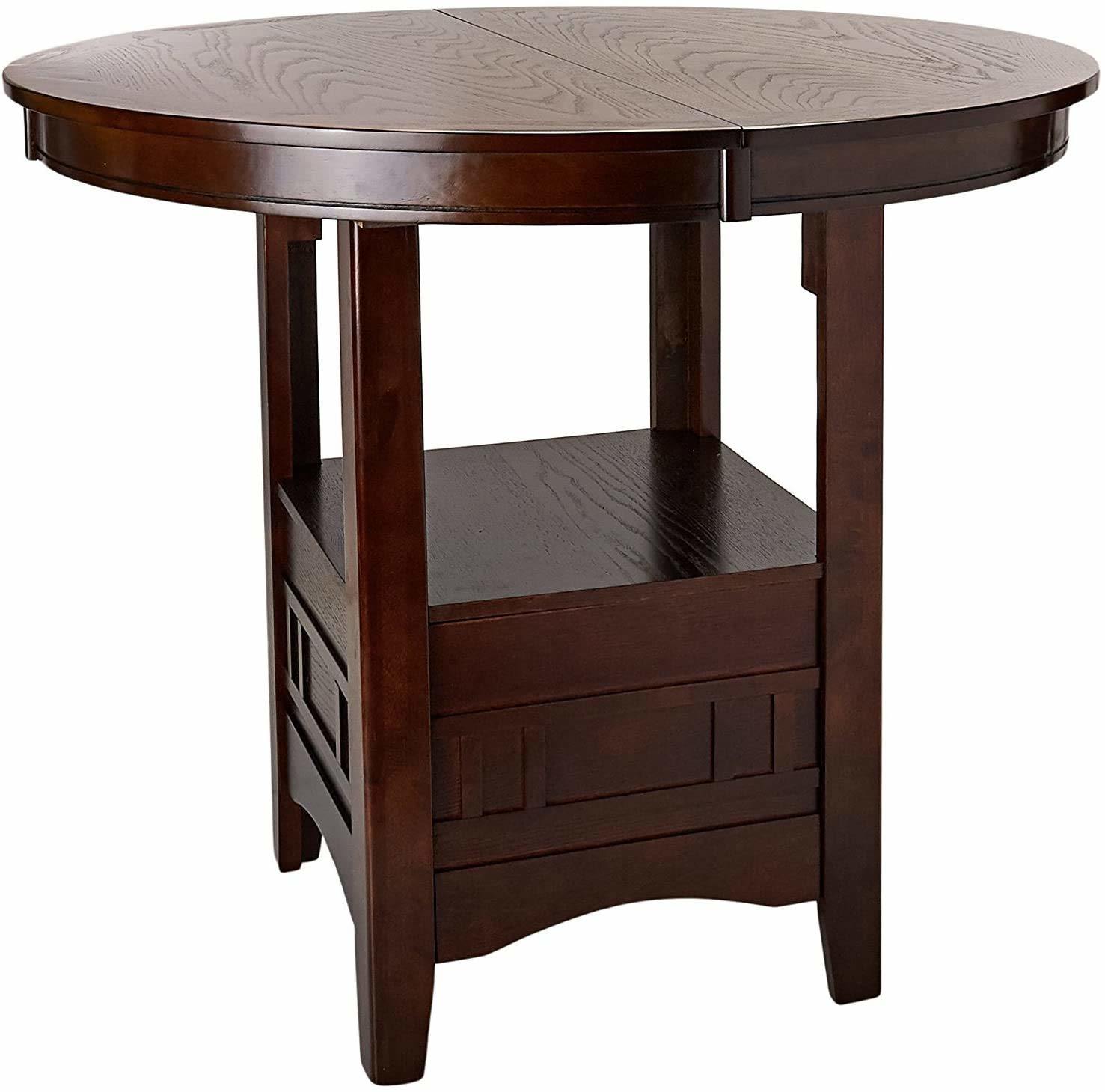 Product Description:Beauty; function and form is provided with this counter height dining table with seating for up to four. Covered in a dark rosy brown finish; it features a square or round shaped table top with a functional built-in Lazy Susan and a lower square shaped storage unit. Match this dining table with counter height chairs in a lovely wood finish; clean lined back supports and cushion upholstered seats.
