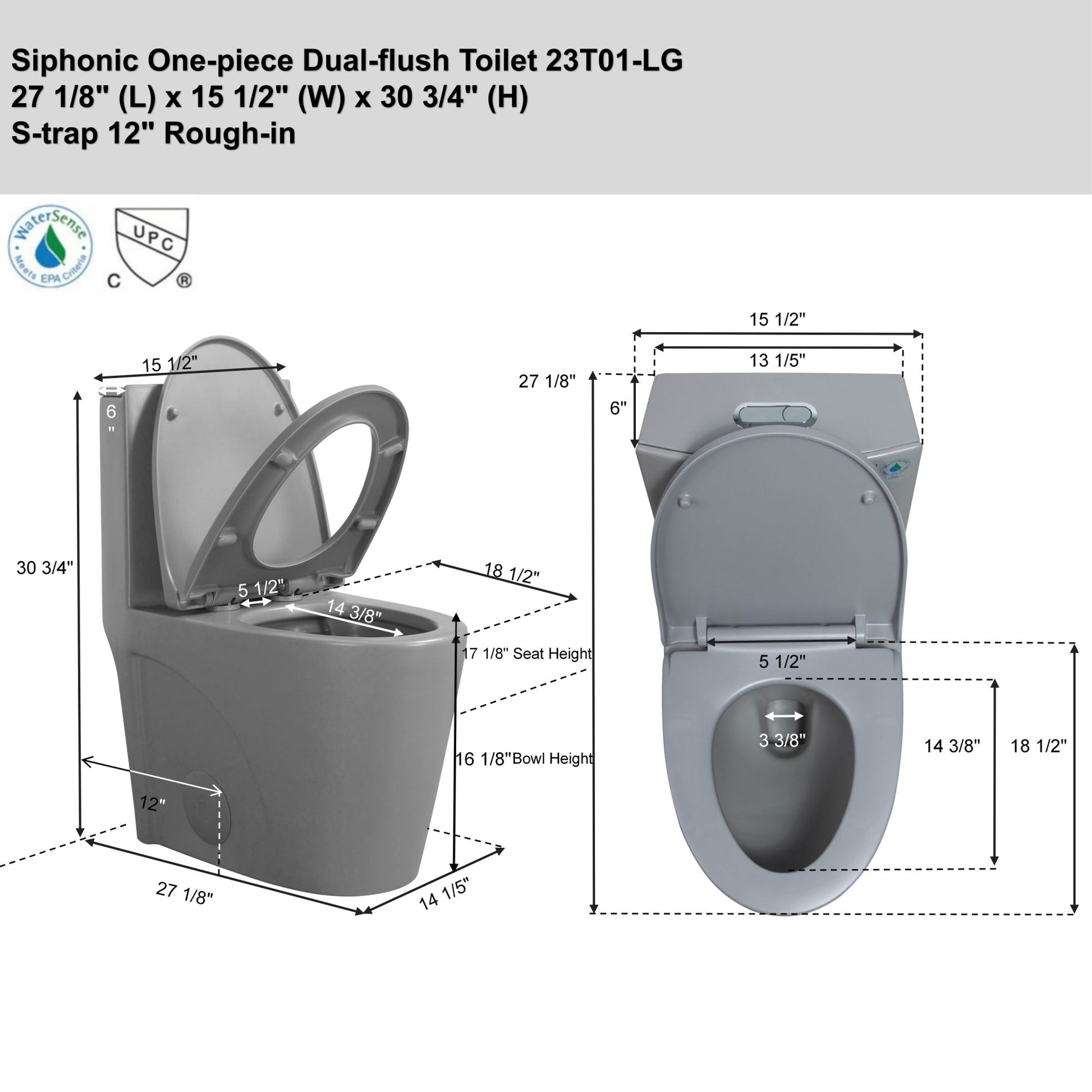 Overall Size: 30-3/4'' H X 15-1/2'' W X 27-1/8'' DNet Weight: 106 lbsFinish: Light GreyWater Consumption: Dual-flush 1.1/1.6 GPFFlushing technology: Siphon JetToilet Material: CeramicMaP Rating: 1000gBowl Height: 16-1/8"Toilet Seat Height: 17-1/8''Rough-in Size: 12''Package Content1 x Toilet Bowl1 x Toilet Tank Lid1 x Flush Valve1 x Dual-flush Buttom1 x Quick-release Toilet Seat1 x Floor Bolts and Caps Set1 x User Manual