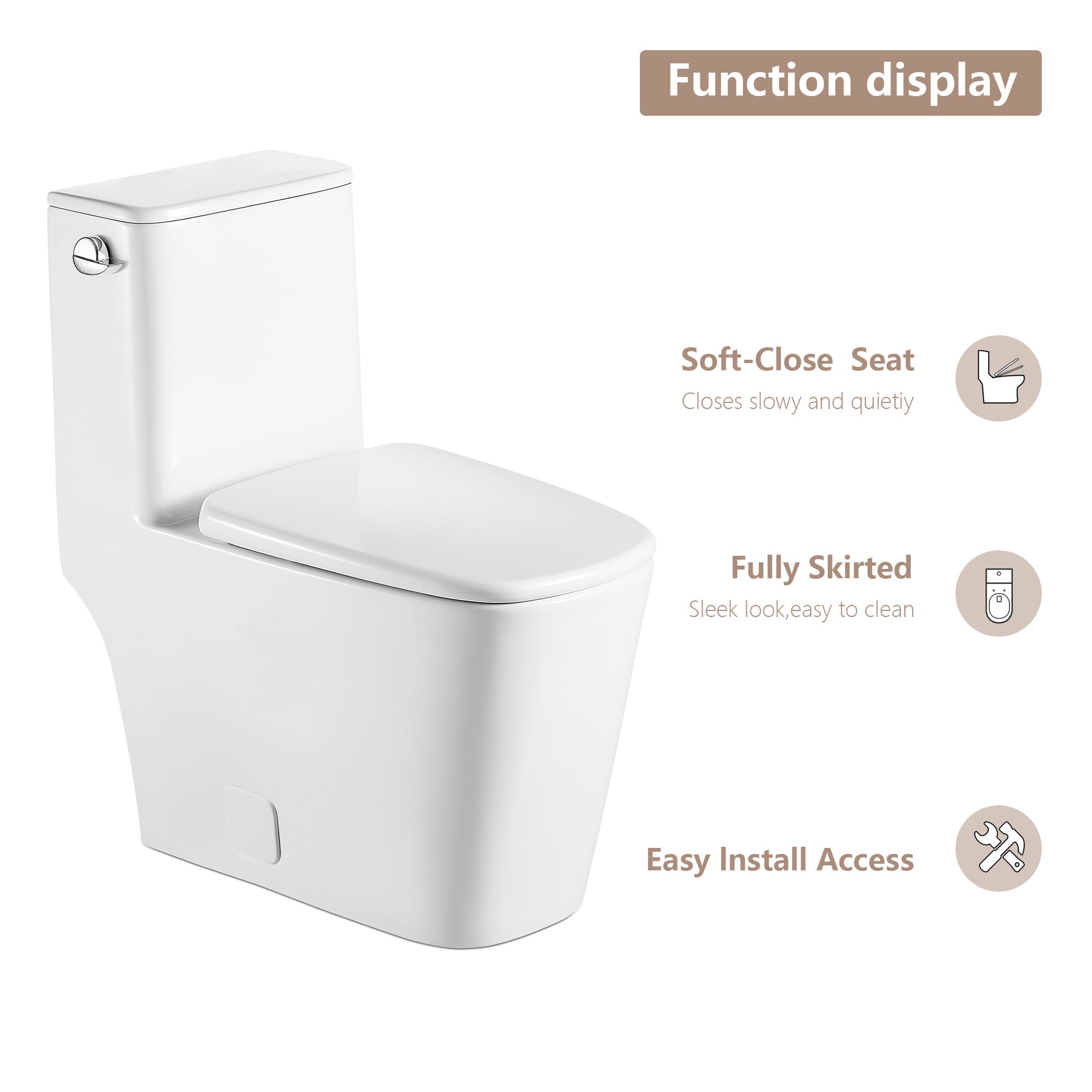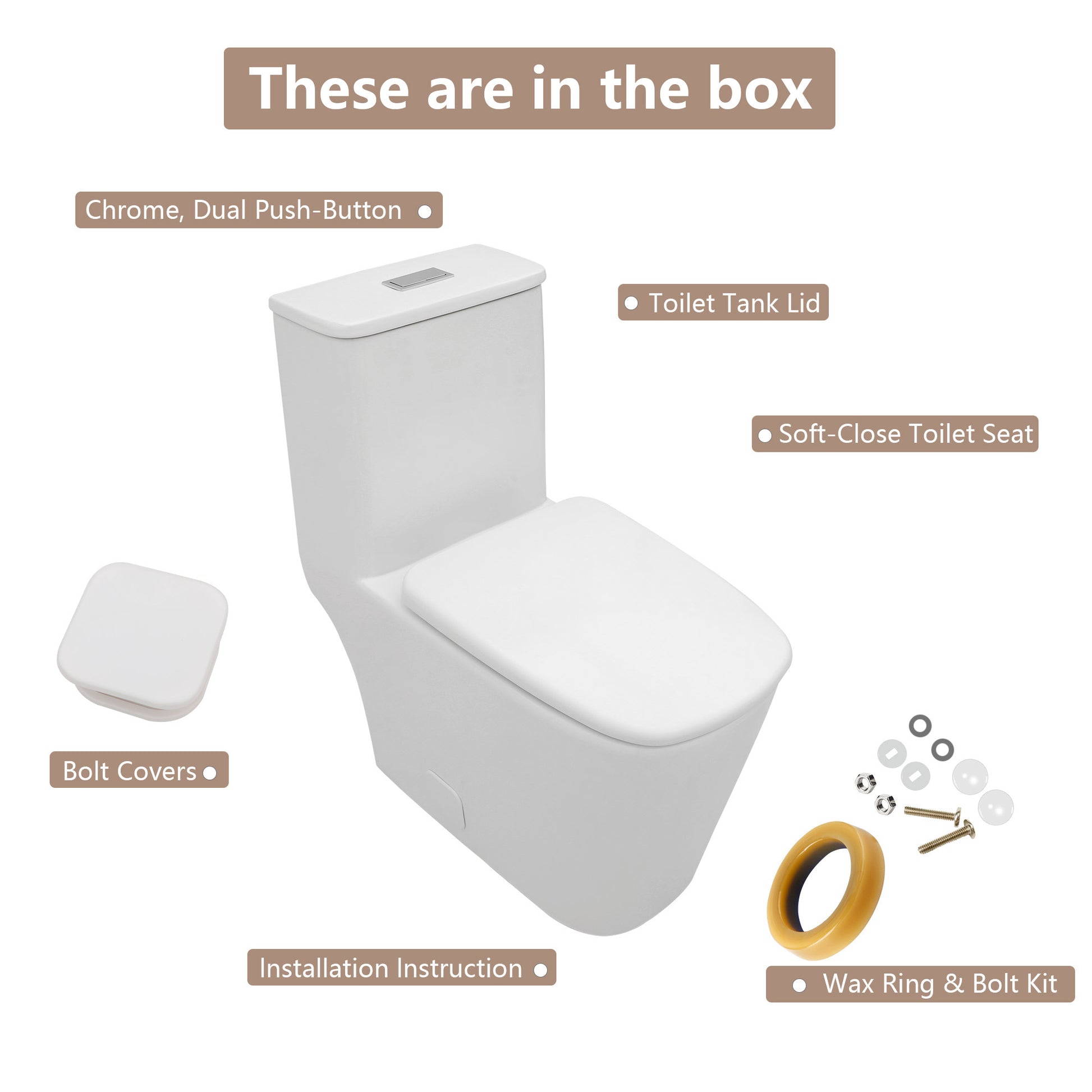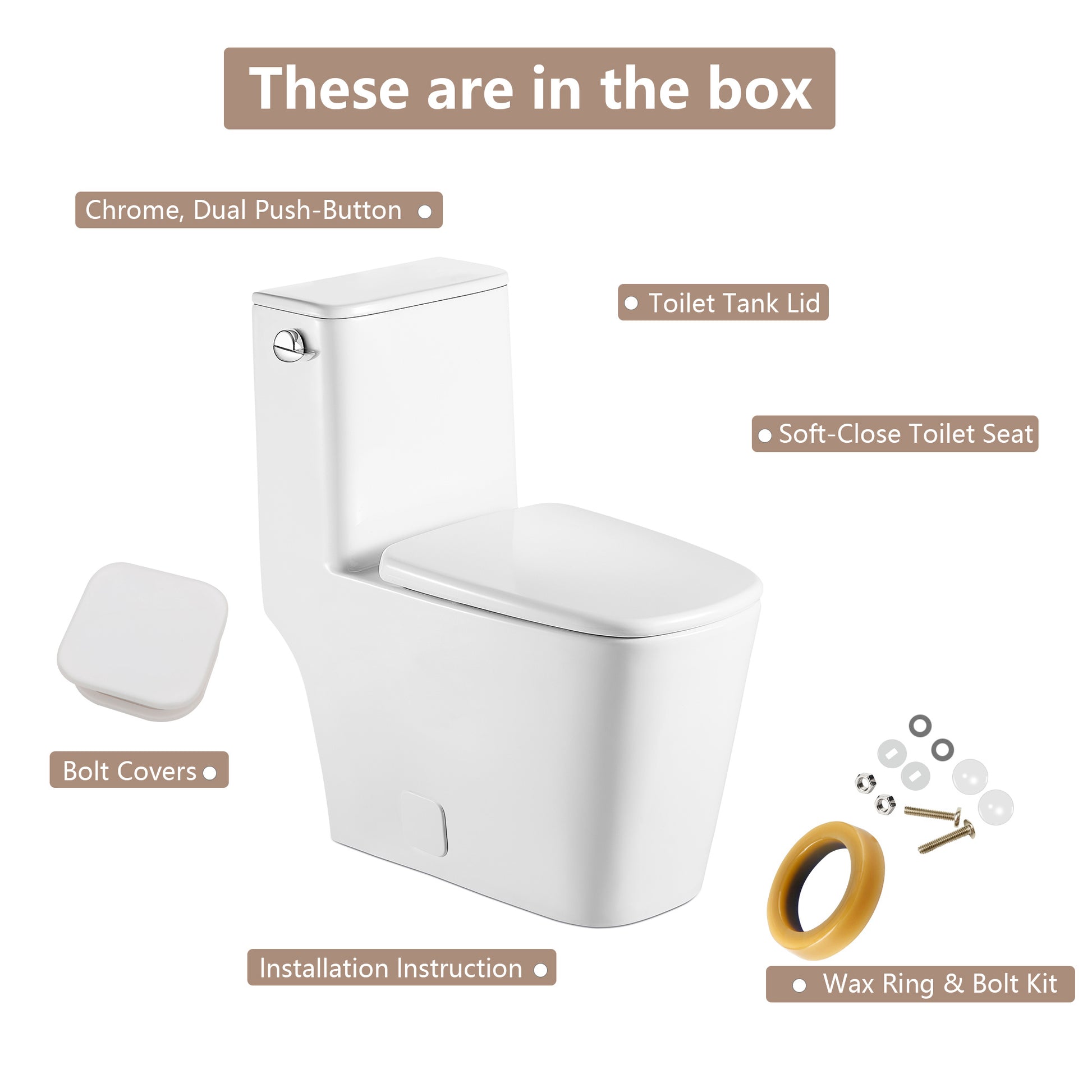 All in one package:a ceramic toilet,a soft-close toilet seat,wax ring,bolt kit,bolt covers, chrome,dual push-button and installation instruction.