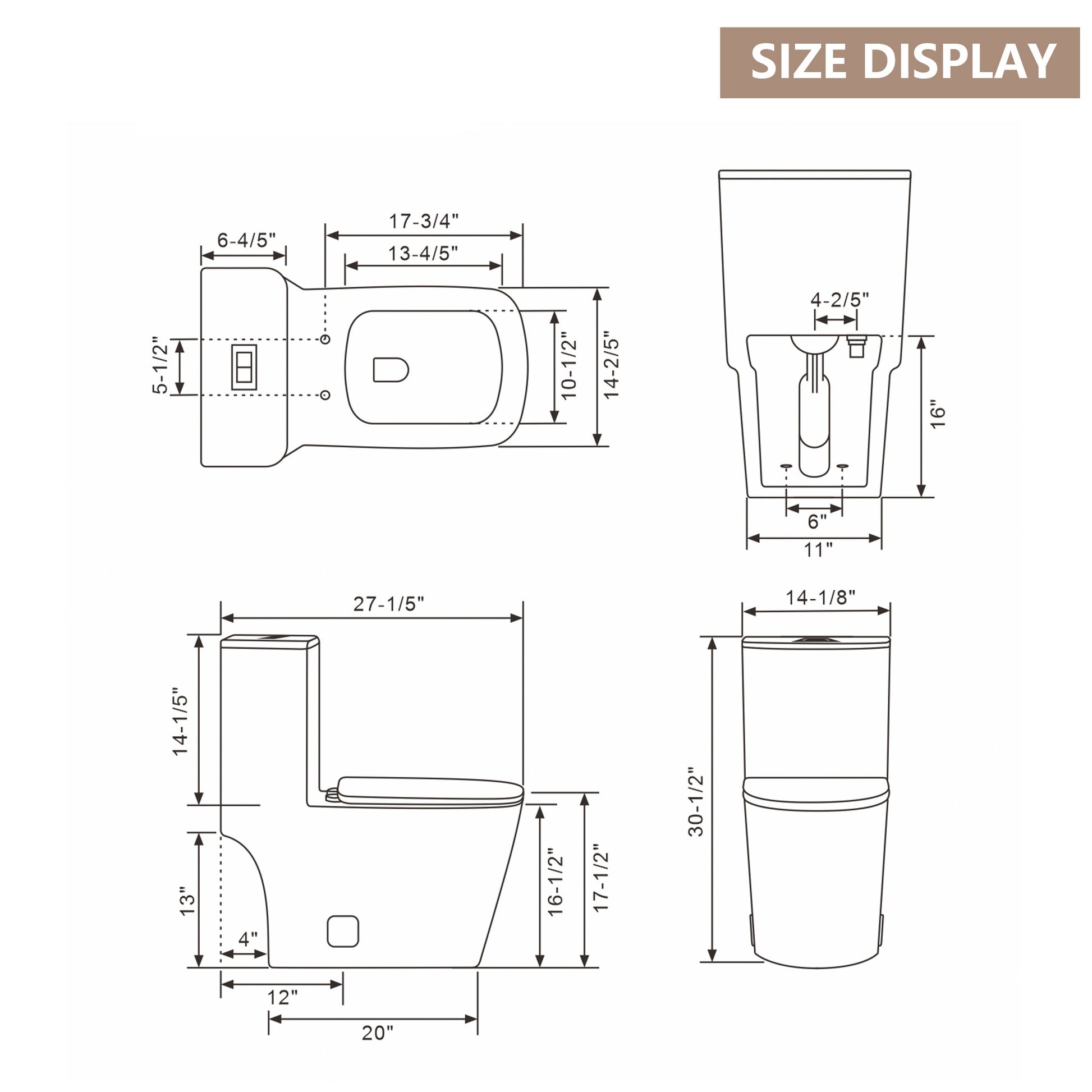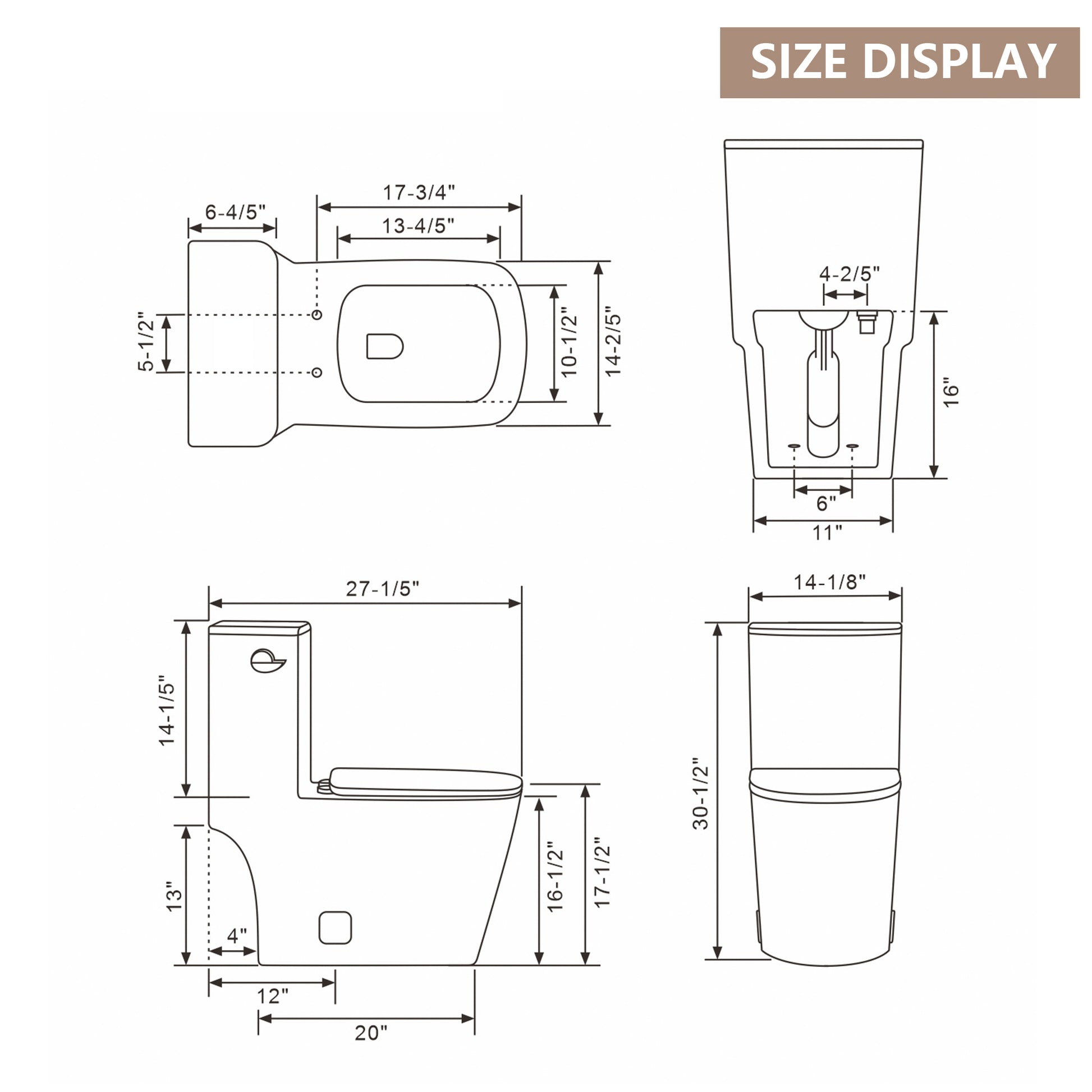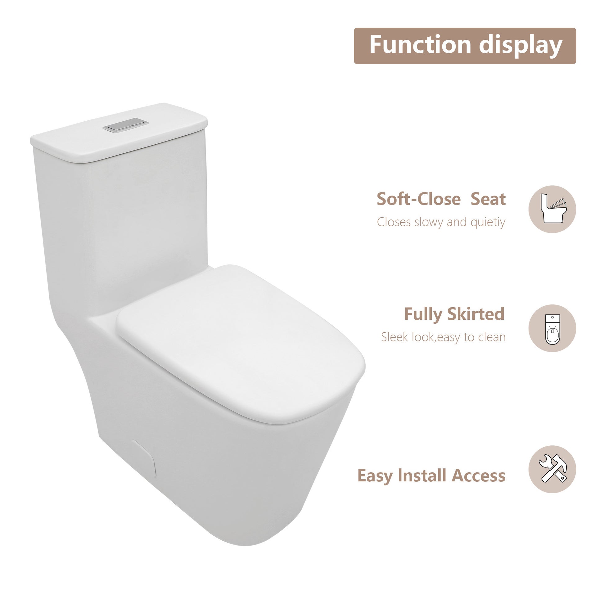 All in one package:a ceramic toilet,a soft-close toilet seat,wax ring,bolt kit,bolt covers, chrome,dual push-button and installation instruction.