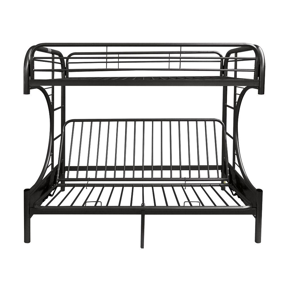 -Bring home this Eclipse twin XL over queen-futon bunk bed to let your kids enjoy personal space without compromising on style. The convertible futon feature allows to switch from a sit to sleep position by simply lifting the light weight of the seat; a quick and easy transformation into a ready to use bed. Superior quality metal for durability; built-in side ladders for easy access; and full length guard rails for safety. Choose from black; blue or silver finish such variety of colors makes it compatible with all types of decor settings. Mattress Not Included |