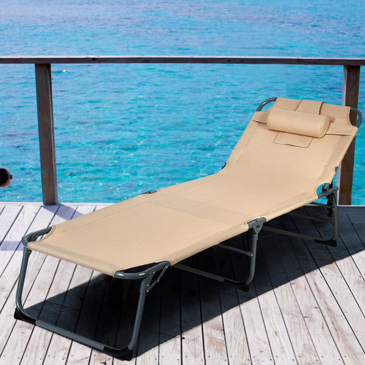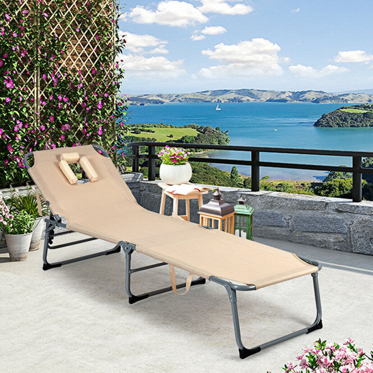 Removable Pillows and Sunbathing Window: This folding patio lounge chair comes with comfortable matching pillows for back lying which are plumped with high resilience sponge. There is also an open cavity for breathing under the pillow to get your back tanned with a comfortable lying position.