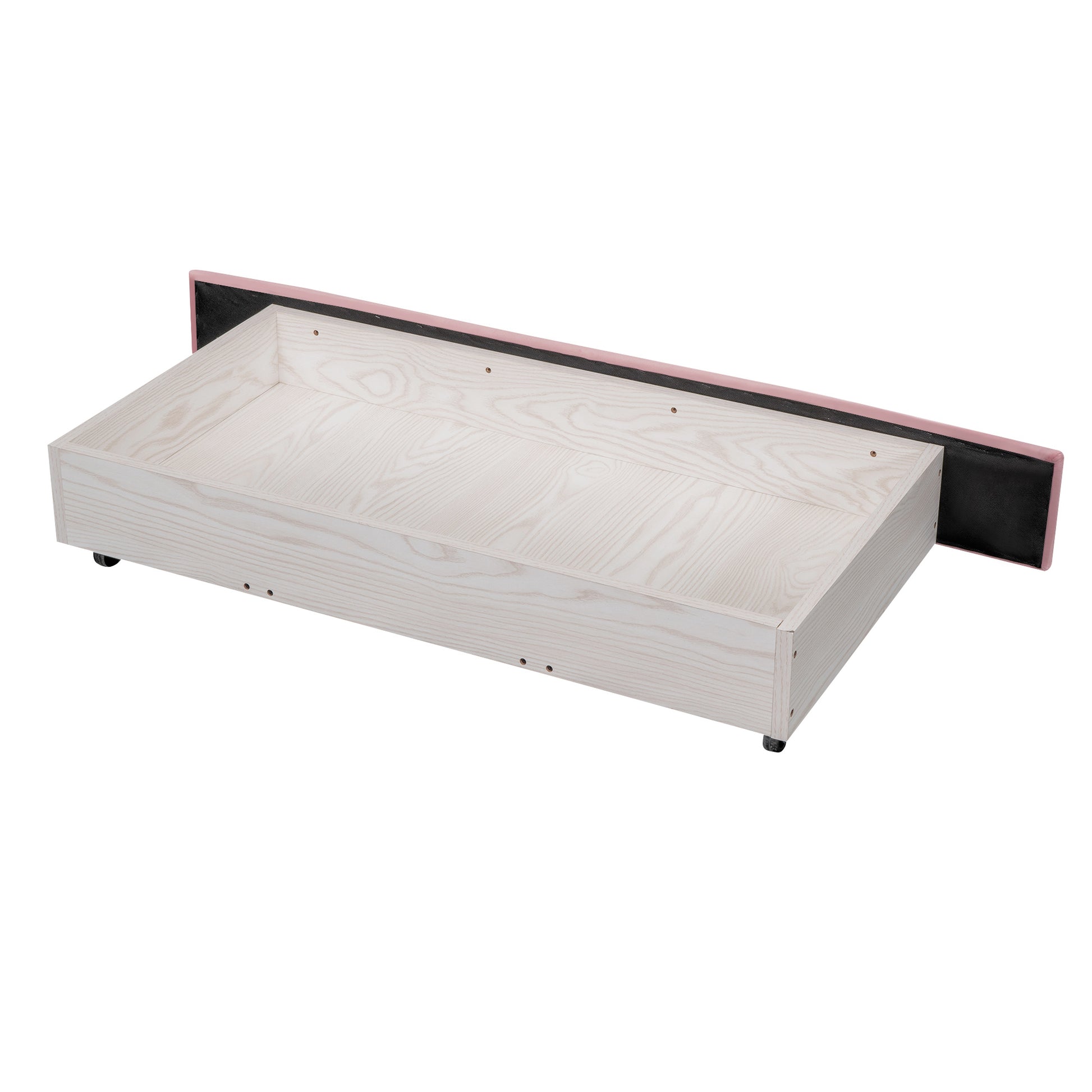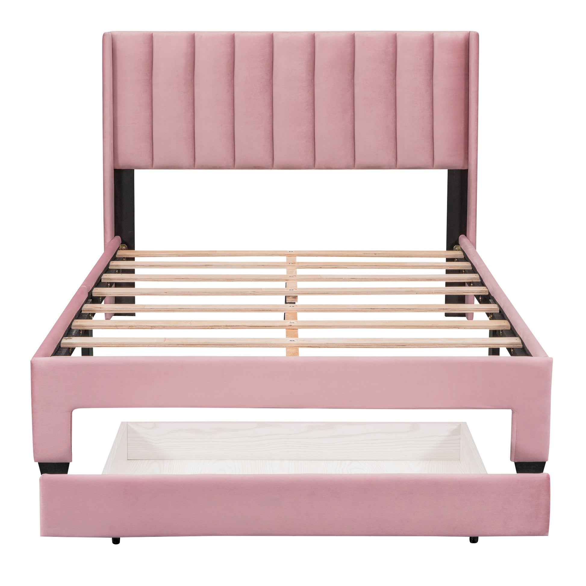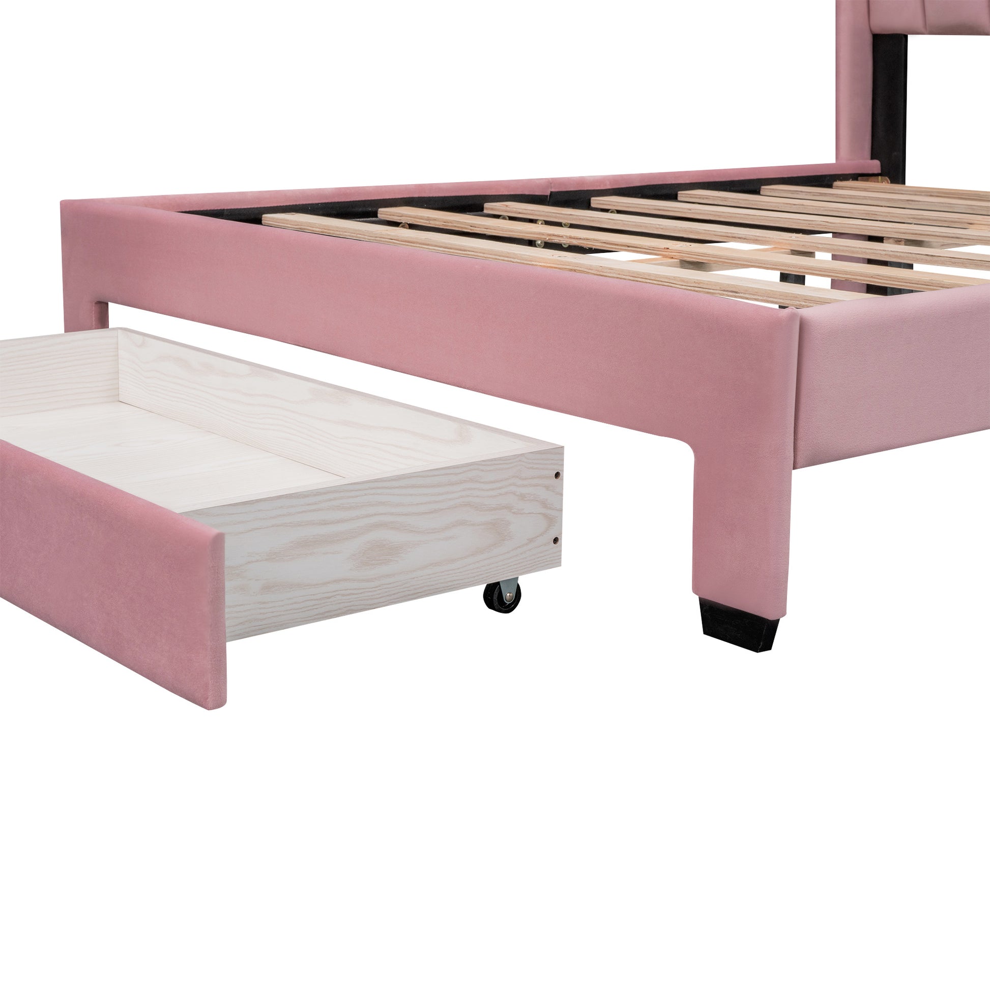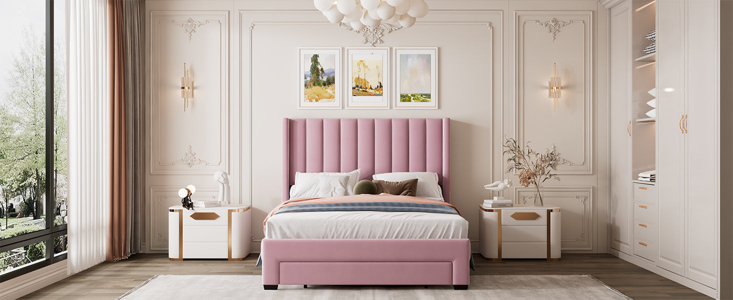 [Large storage space] This upholstered bed has a large drawer at the end for storing bedding; and two small pockets on both sides of the headboard for cell phone storage.