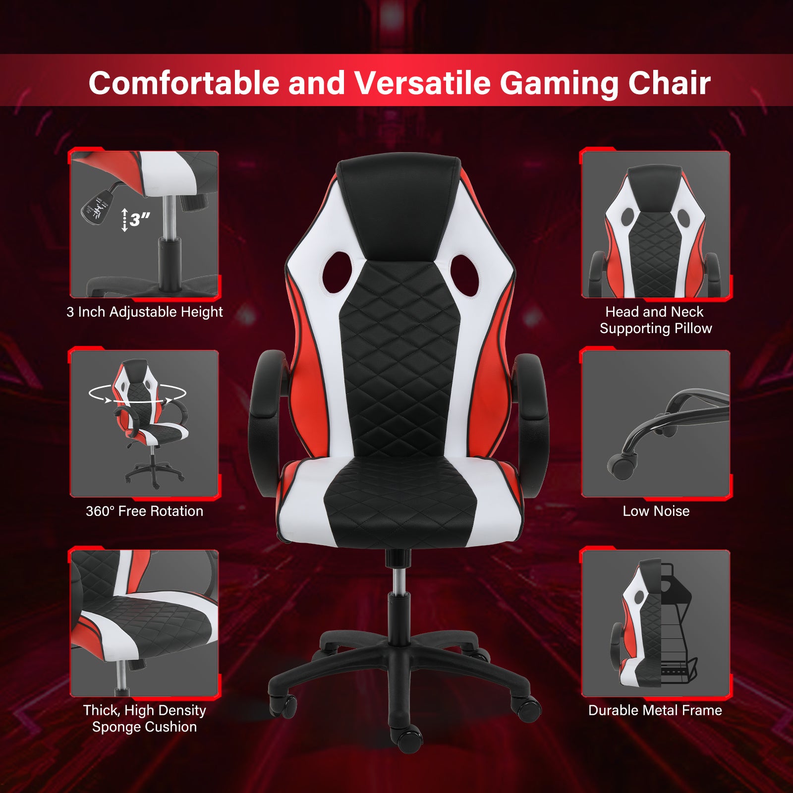 This gaming chair is multifunctional. The ergonomic computer chair with the high-density cushion seat; the high backrest and the wide armrests will become your favorite. Every single part of this chair can be adjusted to your height and body.[Racing Style] This gaming chair is wrapped in black; red and white leatherette and carbon-fiber in a sleek; race-inspired shape; providing immersive gaming experience.[Comfort Design] Ergonomic design helps you maintain a neutral; balanced posture. Well-padded seat; lumbar & headrest cushions make gaming sessions more enjoyable[Fully Adjustable] Large angle adjuster provides perfect angle support from 90 to 120 degrees to suit all your needs. Gas lift cylinder allows height adjusting from 16 to 19 inches. Full 360 degrees of swivel rotation enable dynamic movement.[High Quality] The video game chair use high quality materials - durable metal frame; supportive molded foam; soft PU leather and smooth rolling casters. Offering great stability and mobility for a capacity of up to 440 lbs.[Low Noise] Our gaming chair have smooth roller wheels which doesn't require the mat; it moves smoothly over the carpet and the tile as well. They will not cause damage to the floor and will not make noise during use.