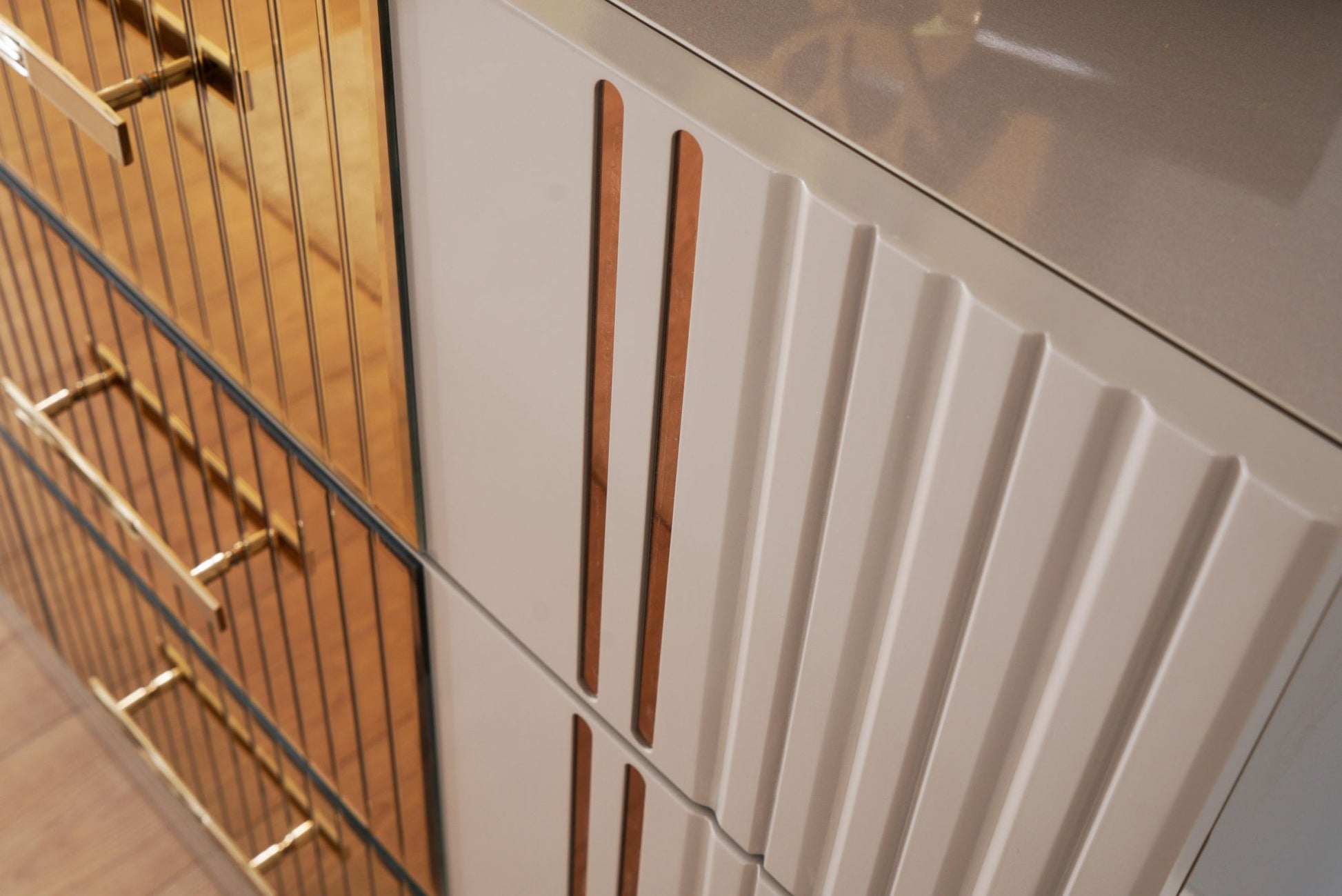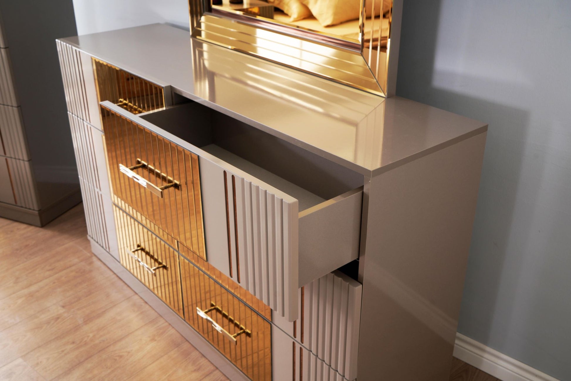 Welcome to a new era of bedroom furniture. Expertly crafted with artistic influence using premium materials for assured quality. This bedroom set is a true spectacle of art. Designed with Metallic River sand-colored imprinted premium upholstery and beautiful bronze mirror accents; this premium bedroom set will become a unique element of magnificence and expression in your bedroom. What truly makes this bed unique is its prodigious headboard; which is wrapped with premium fabric and exclusive tufting from sophisticated technological processes. The common theme throughout this bedroom set is its mirror accents that genuinely give this set a modern luxurious look. The set includes a Dresser. There is plenty of storage space to have all your essentials designated in your bedroom. Slender shapes and simple straight lines enhance the beauty and exciting detail. To mesmerize your bedroom; you should possess this luxury; modern contemporary bedroom set before it is too late.