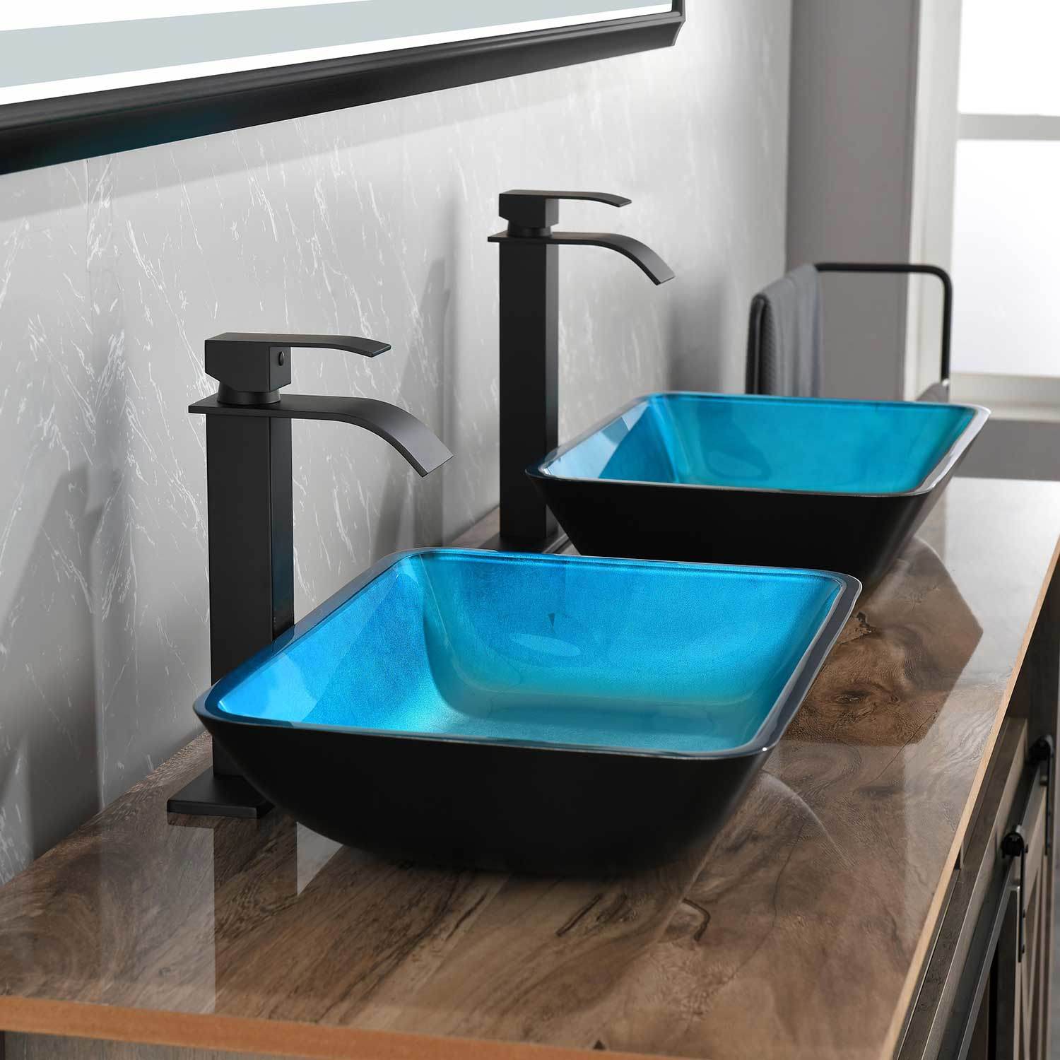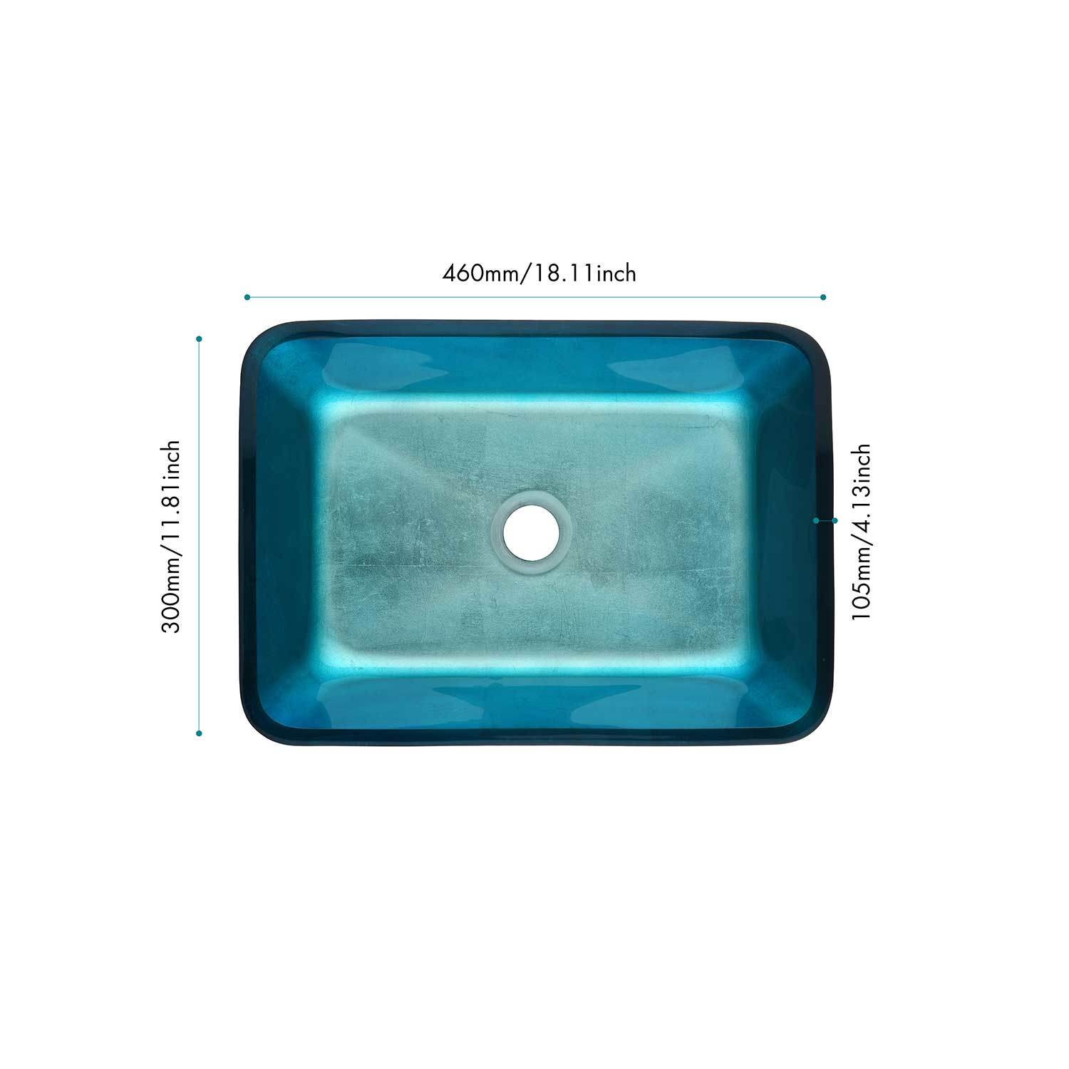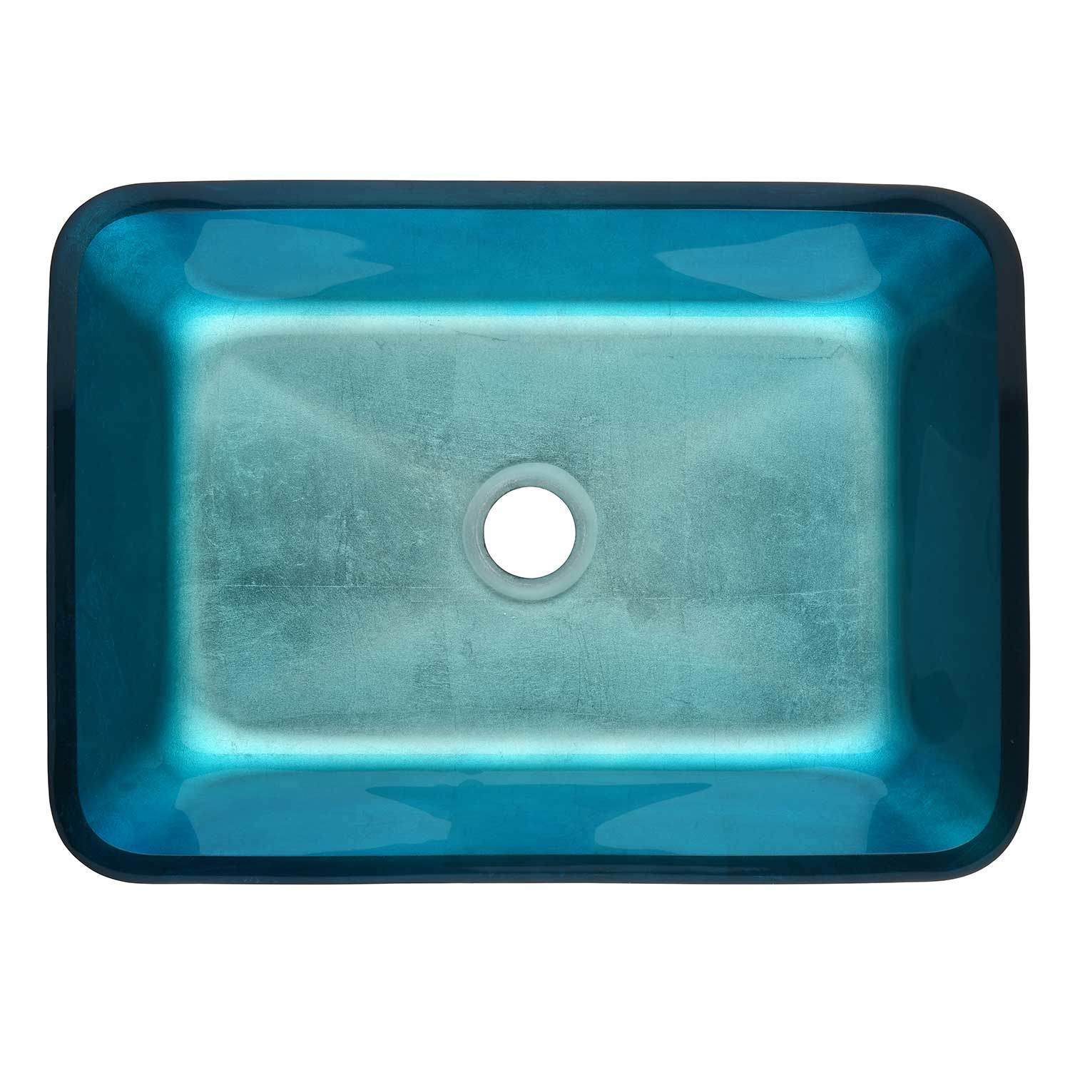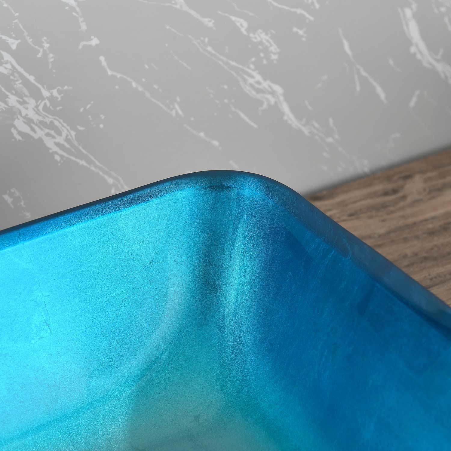 Rectangular Turquoise Water Glass Vessel Sink and Vessel Faucet Set will turn your bathroom into an exotic and sought after destination with an ombre style of sapphire blue colors; resembling the deep waters of the Caribbean. Handcrafted with possible unique and slight color variations so no two sinks are identical. Each sink is a dynamic work of art that complements any style bathroom. With its scratch resistant glass and non-porous surface fading and discoloration is a thing of the past. faucet features a modern single lever for temperature control. This faucet is created using top quality components; including a high quality ceramic disc cartridge means a drip-free; long lasting faucet. All finishes resist corrosion and tarnishing; exceeding industry durability standards. Includes solid brass pop up drain and mounting ring in matching finish.