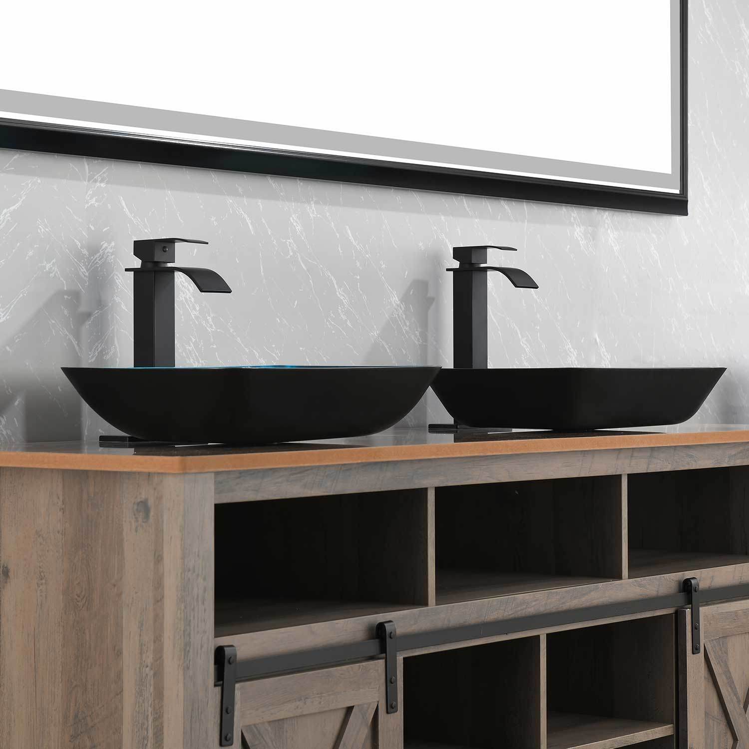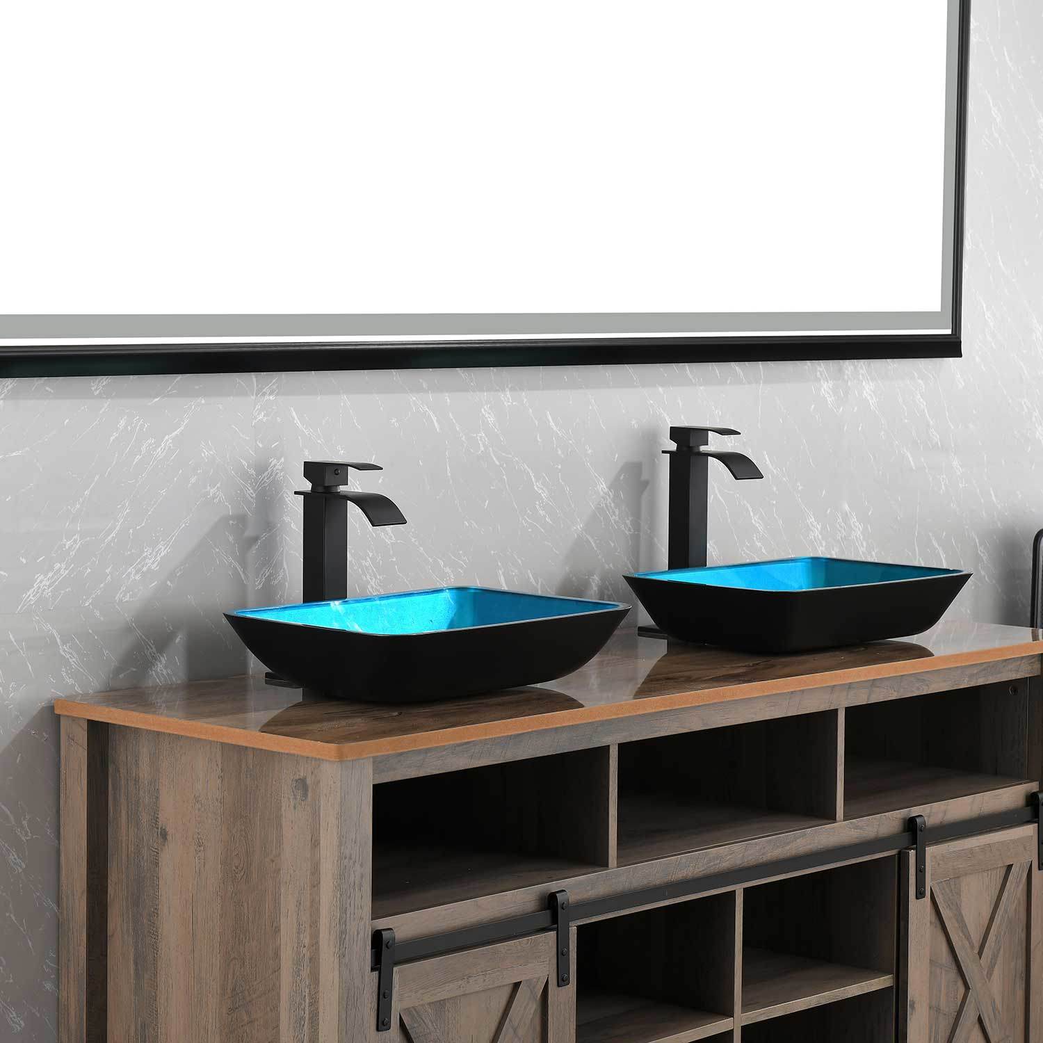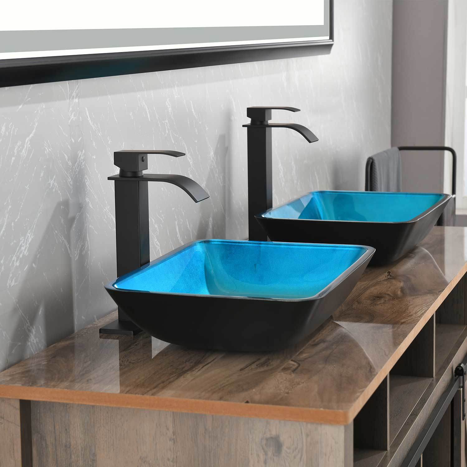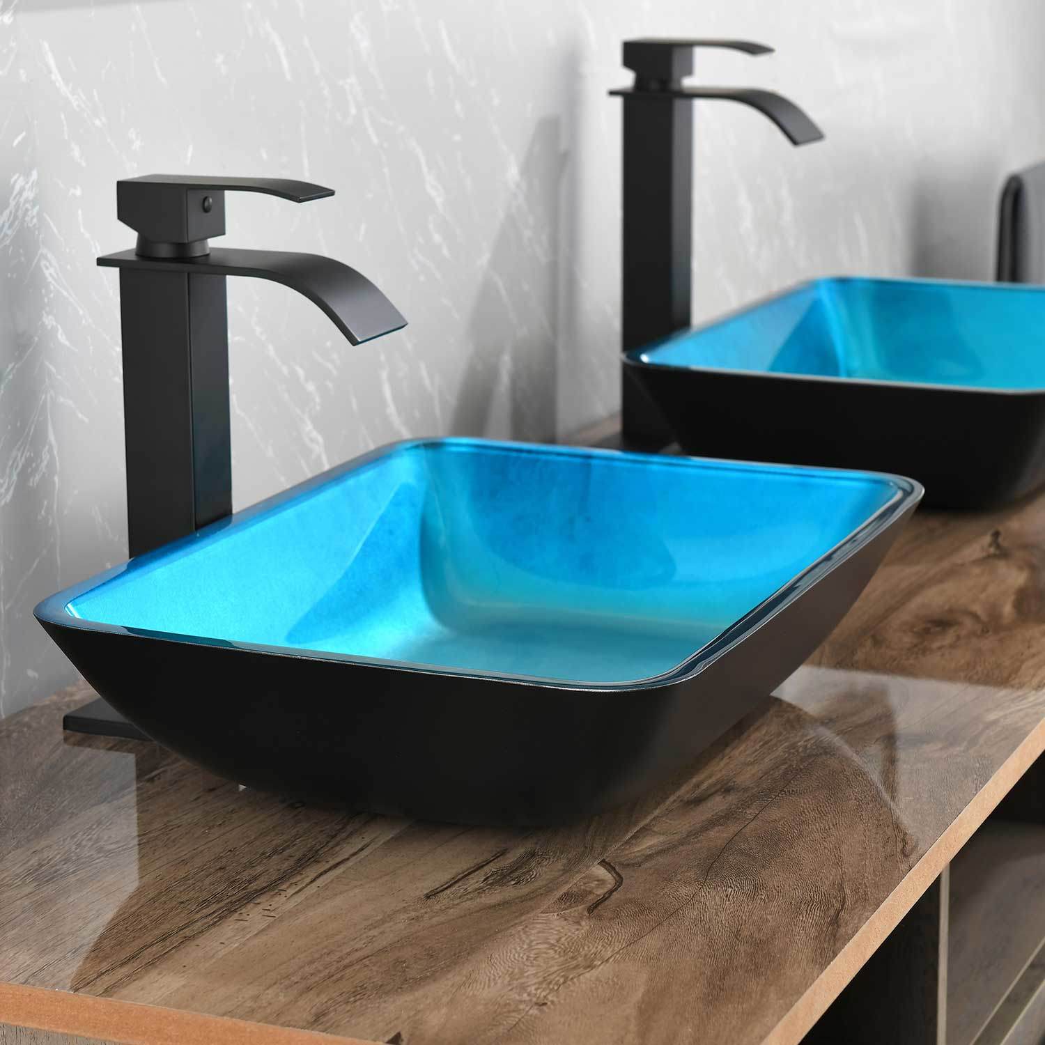 Rectangular Turquoise Water Glass Vessel Sink and Vessel Faucet Set will turn your bathroom into an exotic and sought after destination with an ombre style of sapphire blue colors; resembling the deep waters of the Caribbean. Handcrafted with possible unique and slight color variations so no two sinks are identical. Each sink is a dynamic work of art that complements any style bathroom. With its scratch resistant glass and non-porous surface fading and discoloration is a thing of the past. faucet features a modern single lever for temperature control. This faucet is created using top quality components; including a high quality ceramic disc cartridge means a drip-free; long lasting faucet. All finishes resist corrosion and tarnishing; exceeding industry durability standards. Includes solid brass pop up drain and mounting ring in matching finish.