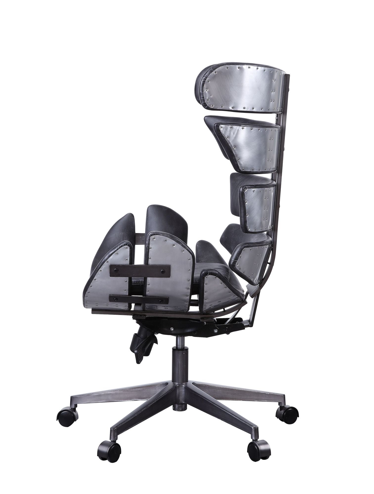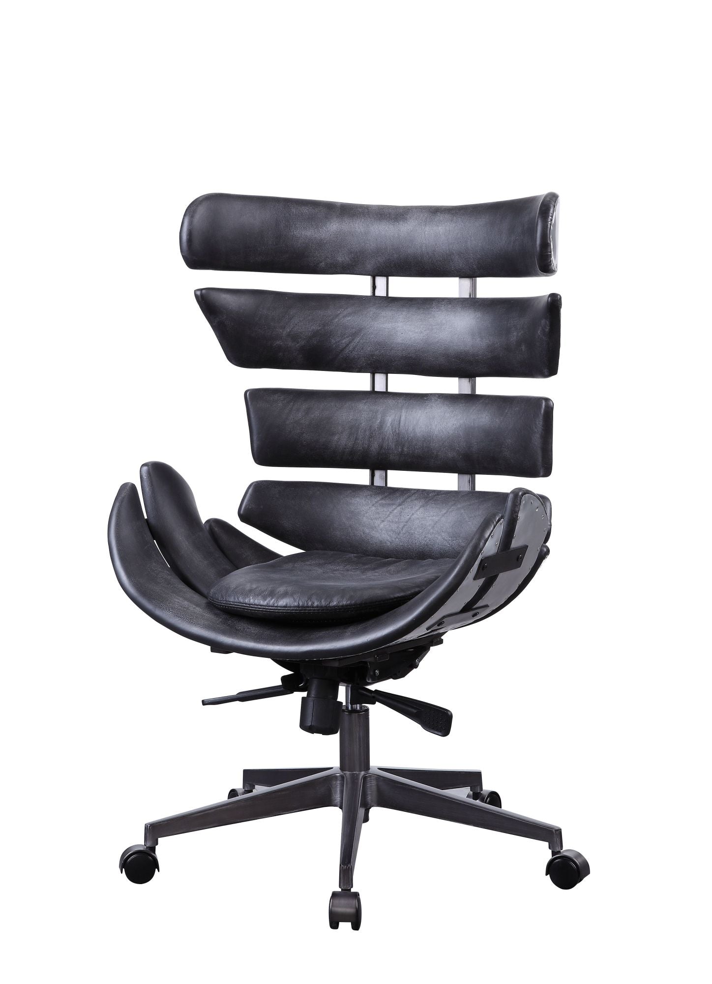 Product Details : KD; Executive Armless Office Chair (High Back) : Seat: Swivel (360 Degrees); Adjustable Height (Pneumatic Lift); Bucket Shape : Padded Seat & Back: Top Grain Leather Cushion; Patchwork Aluminum Outside; Horizontal Panels; Inner Frame: Ply : Armless : Backrest: Wingback : 5-Star Base w/Casters: Metal Base; Matte Iron