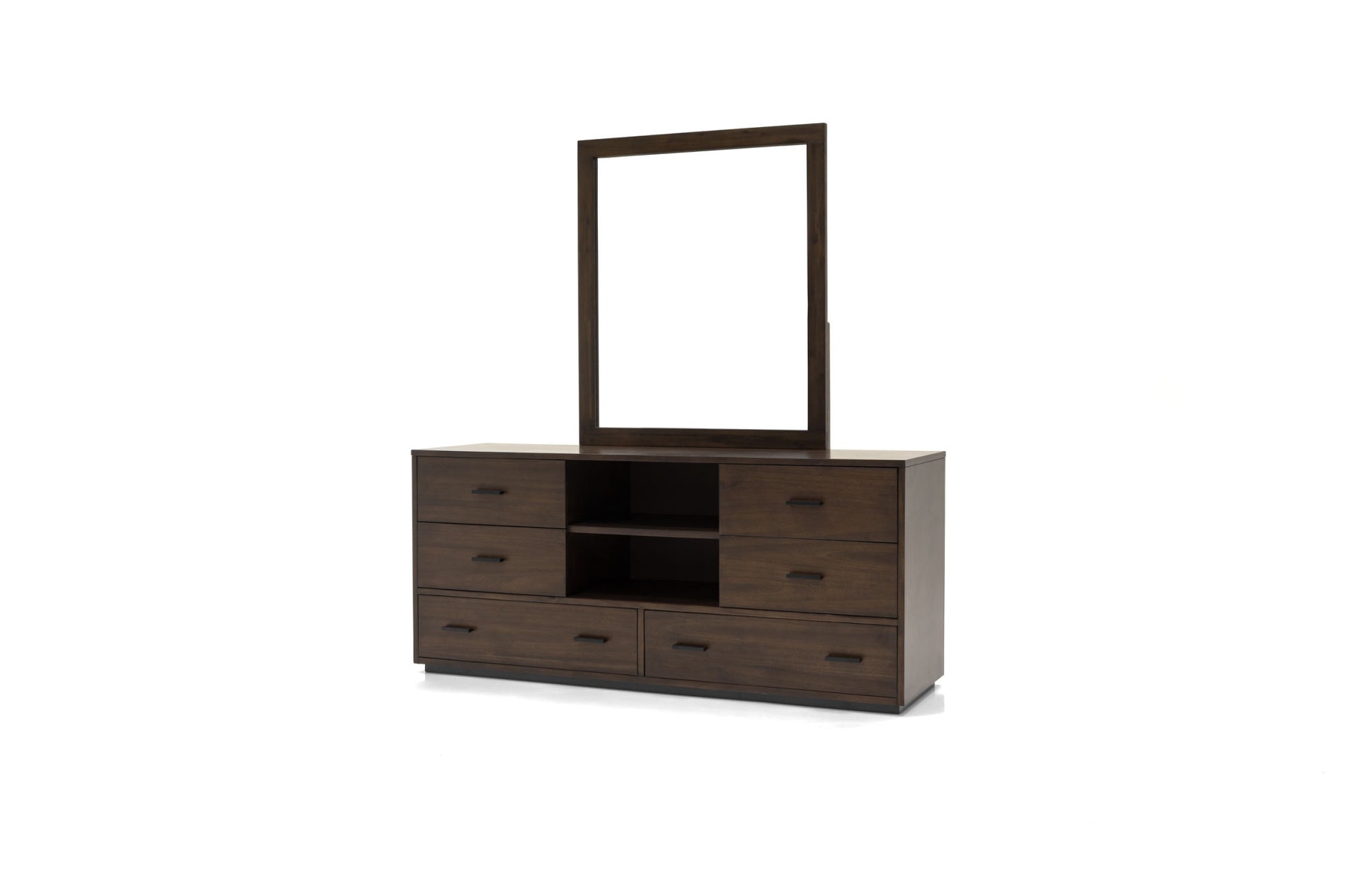 In today's technologically advanced times; the need for a dresser that can hold clothes; but also support a flat screen TV has never been greater. This contemporary dresser; which features six felt-lined drawers and two open cubbies; is a dresser that has a solid acacia and MDF construction.Features:Solid Acacia + MDF construction. Walnut Finish and Walnut Veneer. 6-Felt lined drawers. Ball Bearing Drawer Glides. Matte Black Metal Handle. 1-Interior Shelf. Tip Over restraint device included. No Assembly required. Dimensions:Overall: W63" x D17.72" x H27.95" Small Drawer Interior Dimensions: W19.5" x D14.5" x H6.7" Large Drawer Interior Dimensions: W29.37" x D14.5" x H6.7" Drawer Weight Capacity: 55 lbs. Shelf Dimensions: W19.5" x D16.93" x H7.87" Shelf Weight Capacity: 55 lbs.