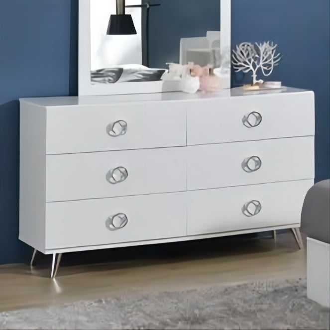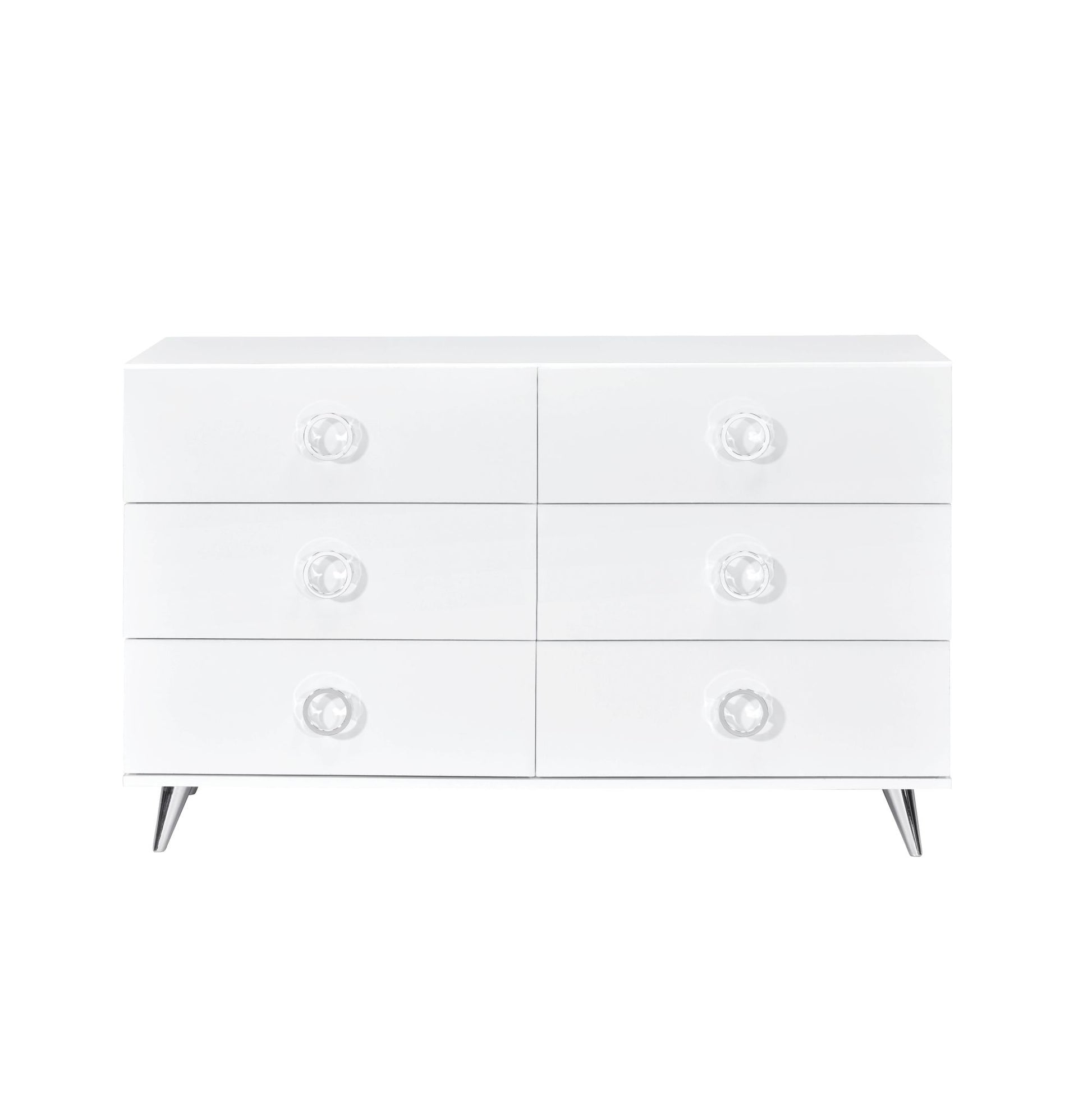 -Sleek; modern; and functional are what best describe the Perse collection. The crisp white finish gives off the illusion of a bigger room. The low-profile panel bed features a storage headboard to display various goods. The case goods offer plenty of storage to keep a tidy room. With modern touches such as round chrome hardware and metal hairpin legs to match. |