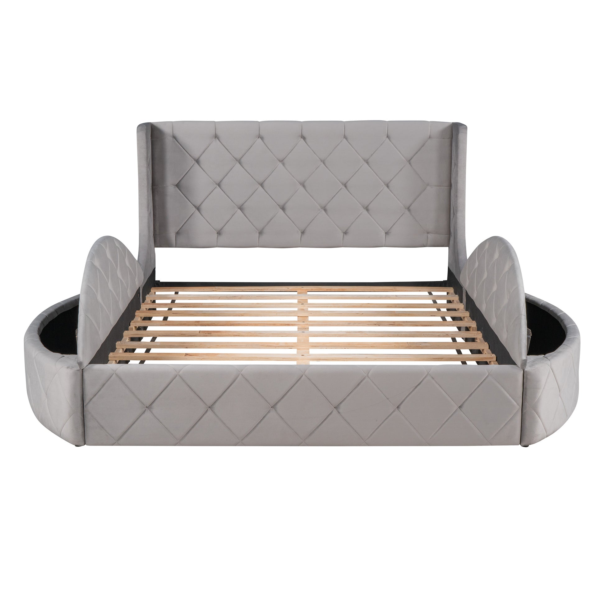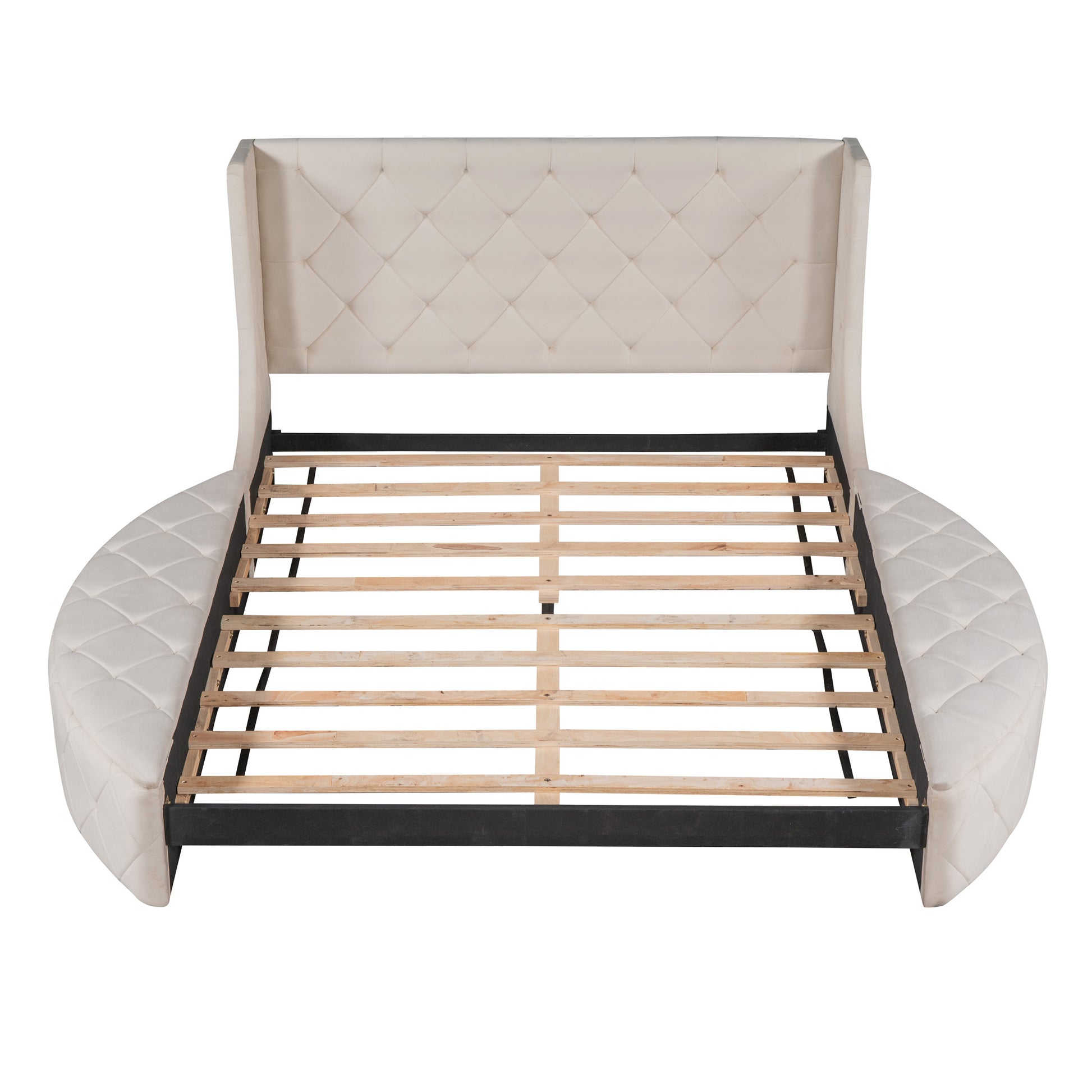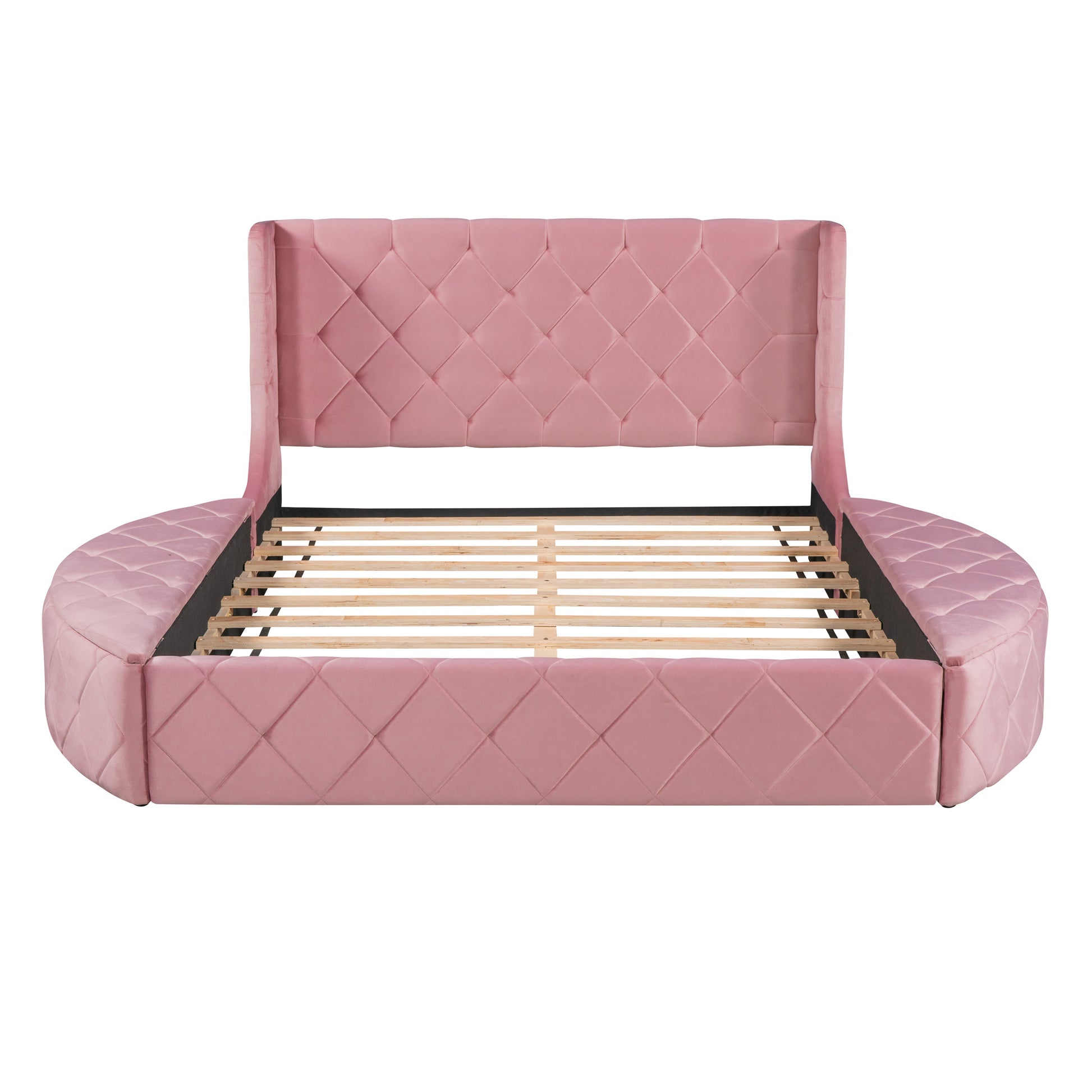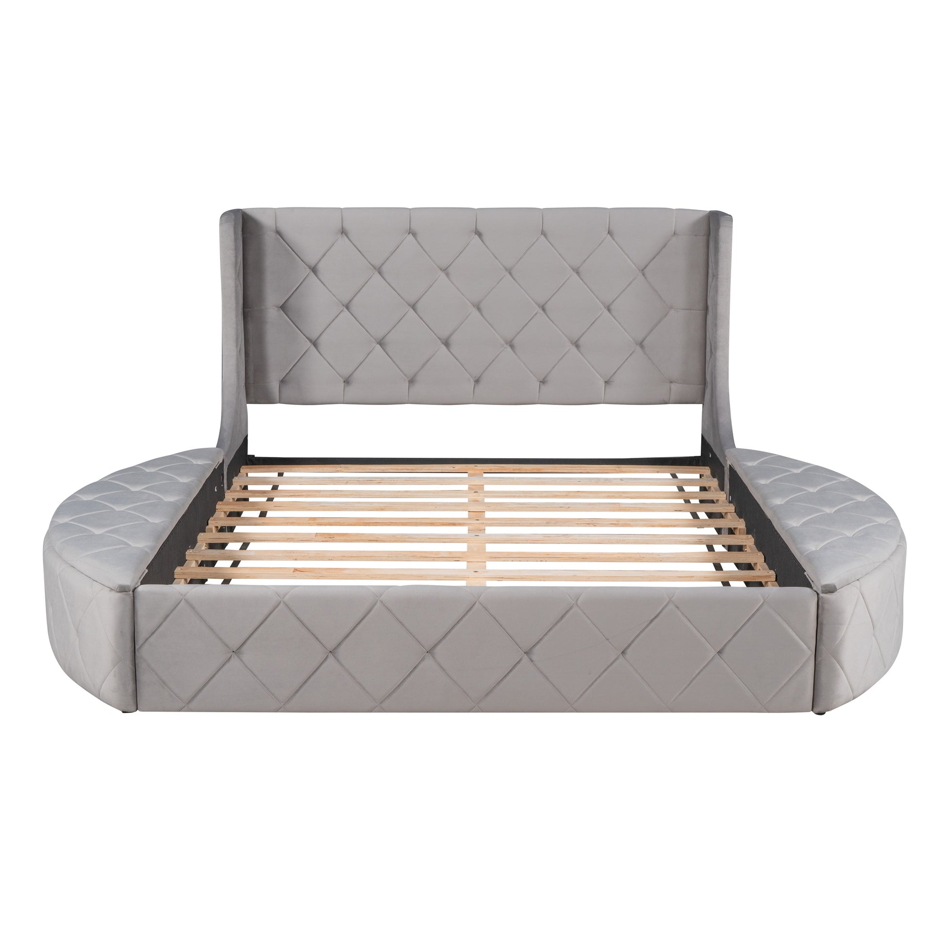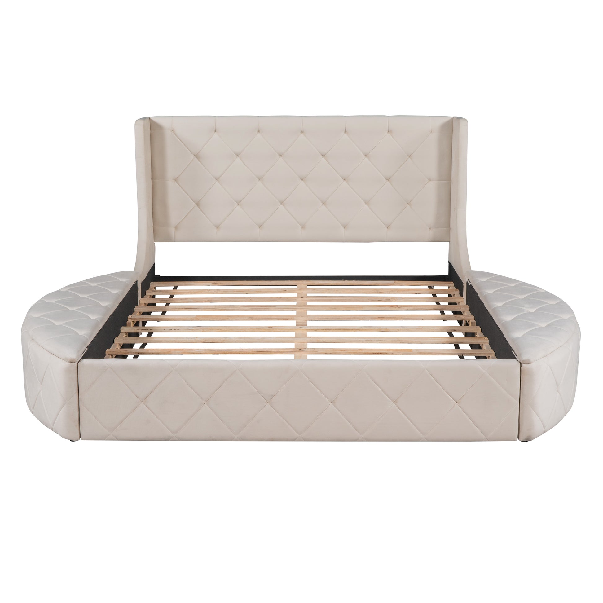 This beautiful upholstered bed features two semi-circular storage stools on the left and right; a feathered headboard and a large storage drawer at the rear; which is both functional and beautiful for you The bedroom adds splendor. Sturdy wood frame construction and wood slat system add extra stability and safety. With such a sturdy; on-trend design; you can have a unique and surprising shopping experience. We expect a well designed bed to suit anyone's needs; our beds come in four colors that will suit any of your different bedroom decor