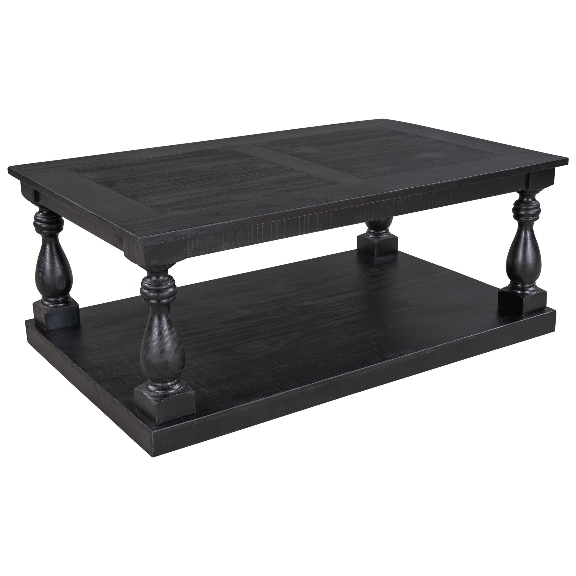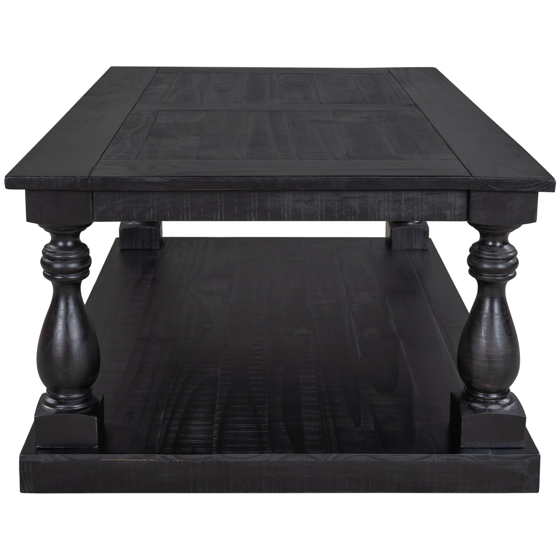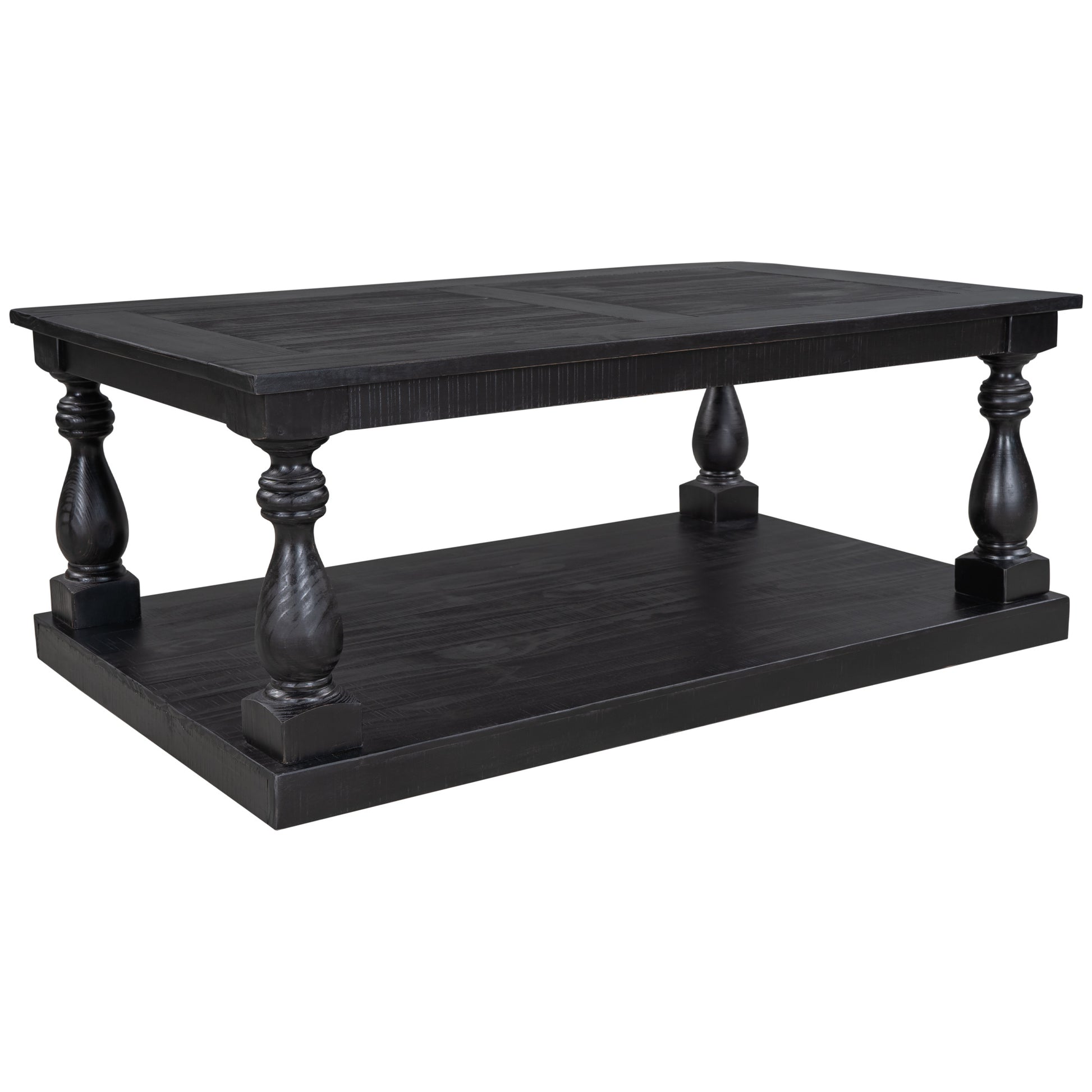This coffee table strikes a chunky; rectangular silhouette with hand-turned baluster column posts; for a classic rustic look.