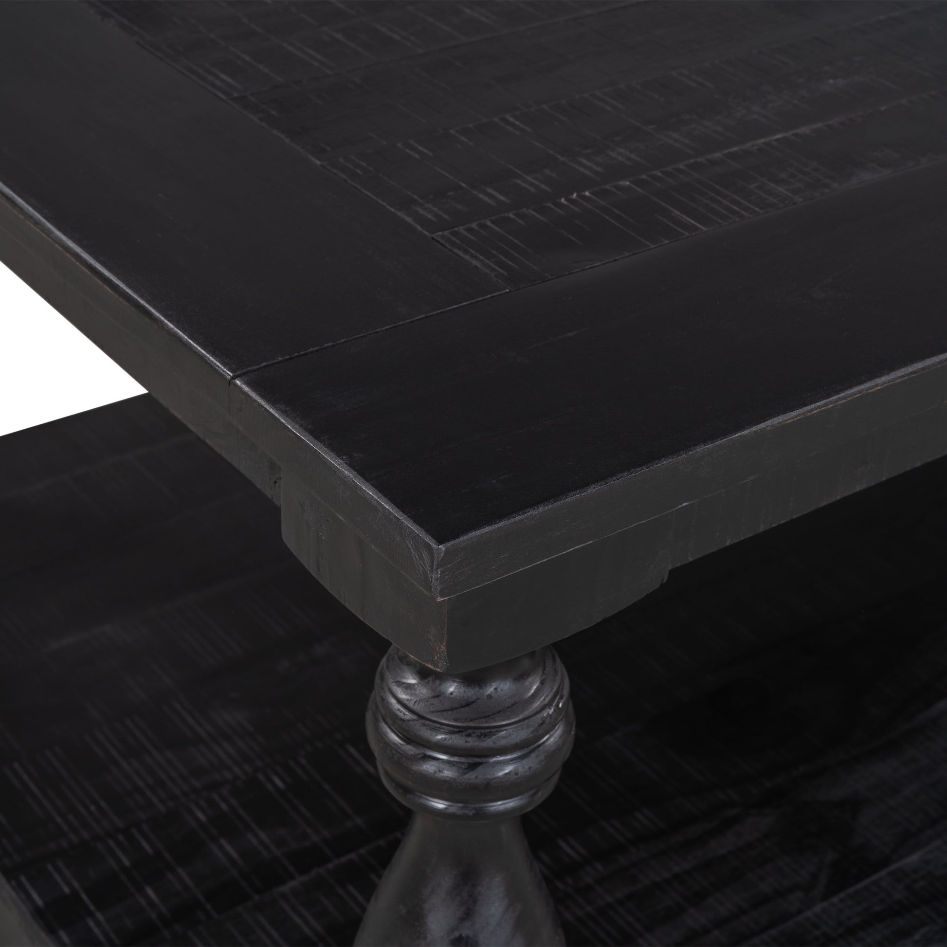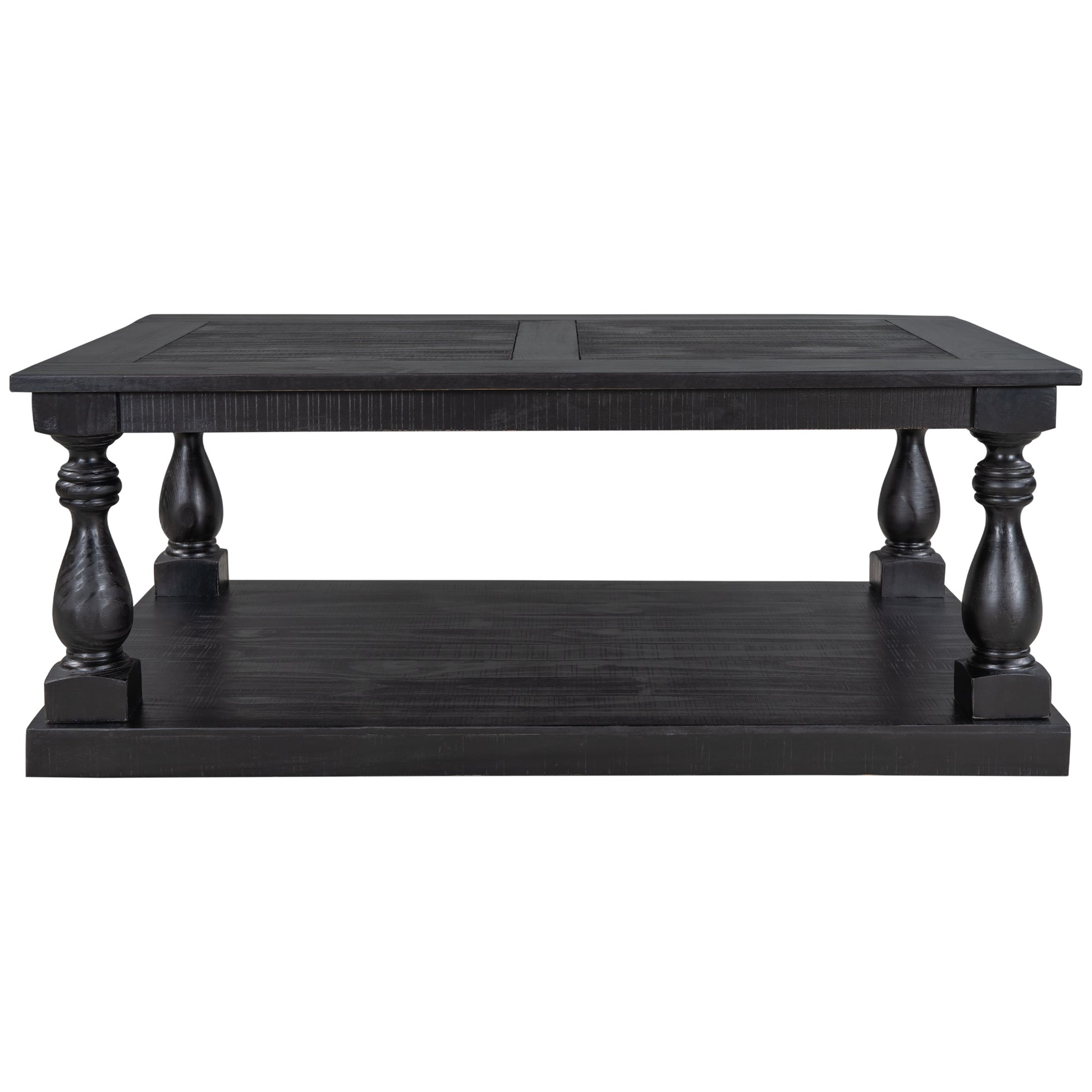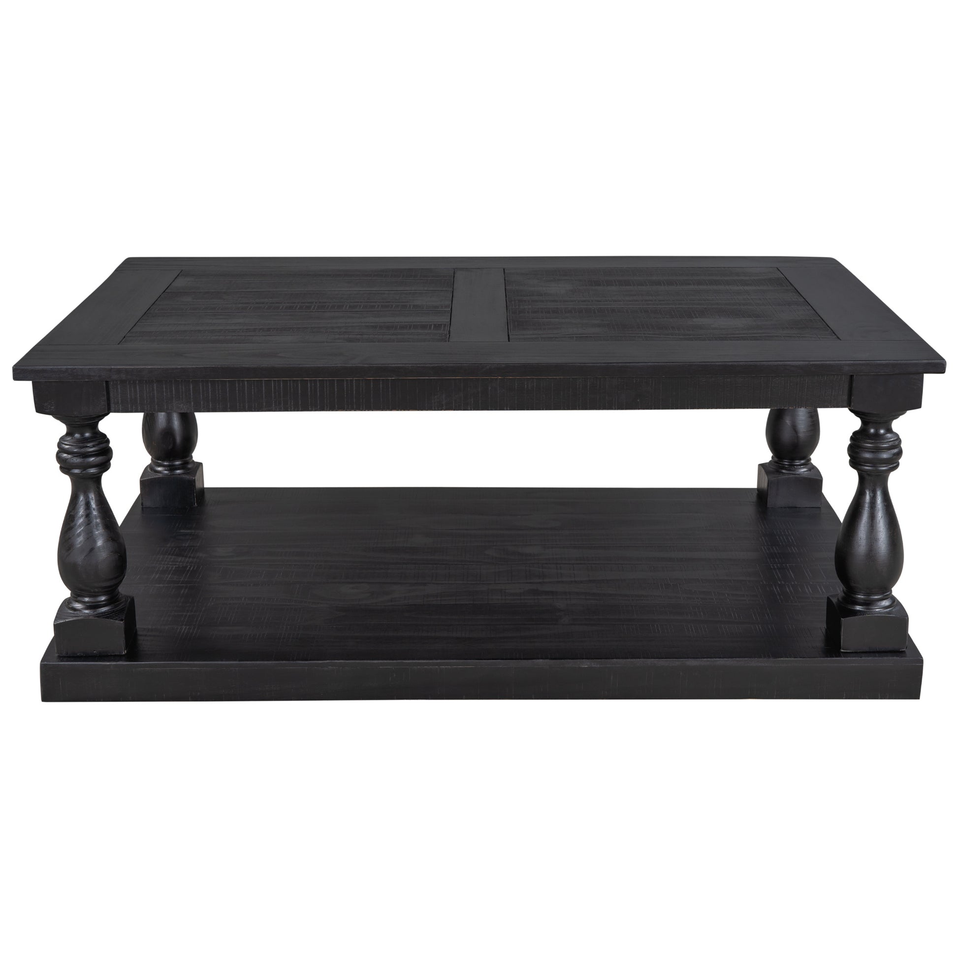 This coffee table strikes a chunky; rectangular silhouette with hand-turned baluster column posts; for a classic rustic look.