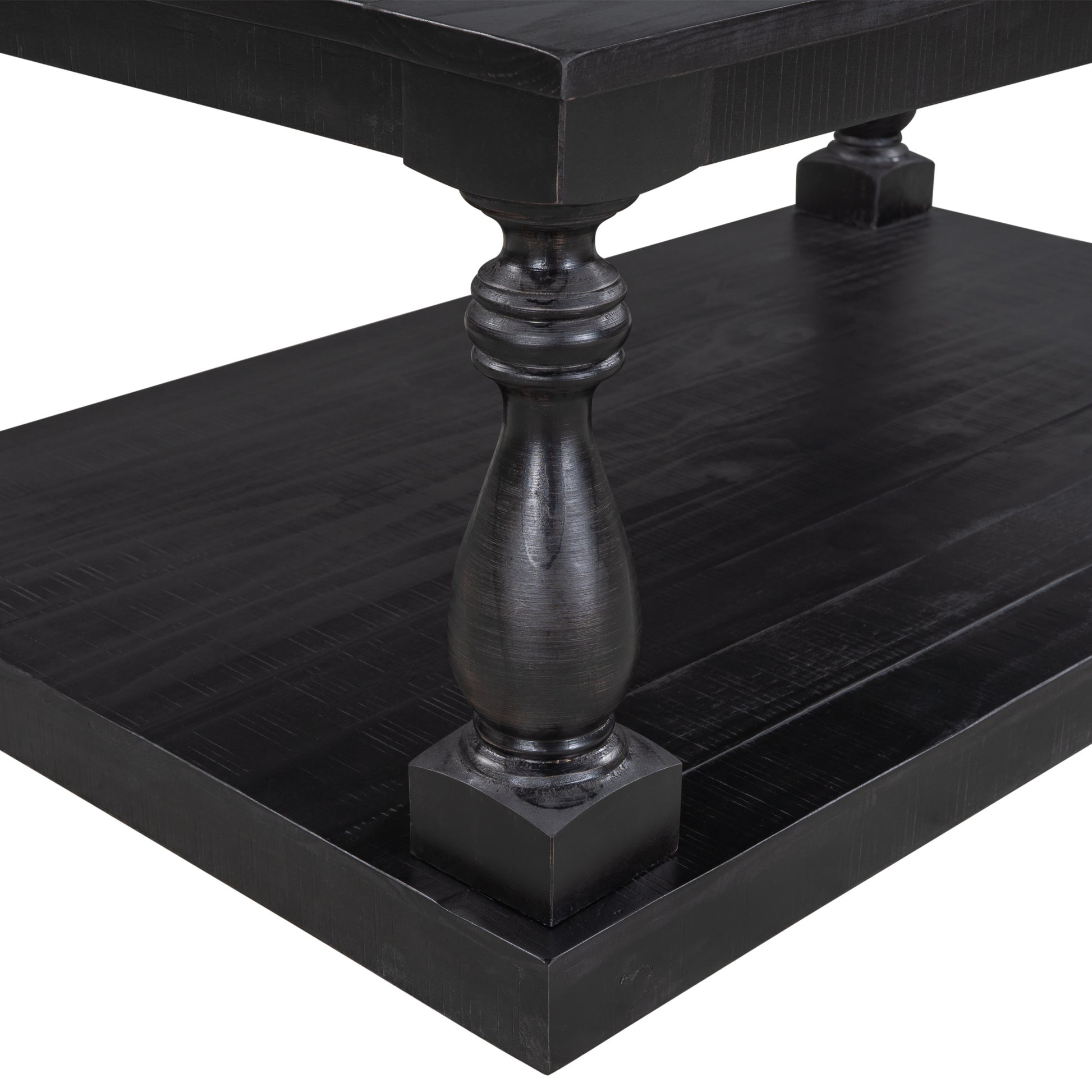 Eye-catching carved detailing is featured in each of the four support pillars for an elegant finishing touch to this piece that will effortlessly complete your space. Maximum top weight capacity: 175lbs. Maximum bottom weight capacity: 220lbs.